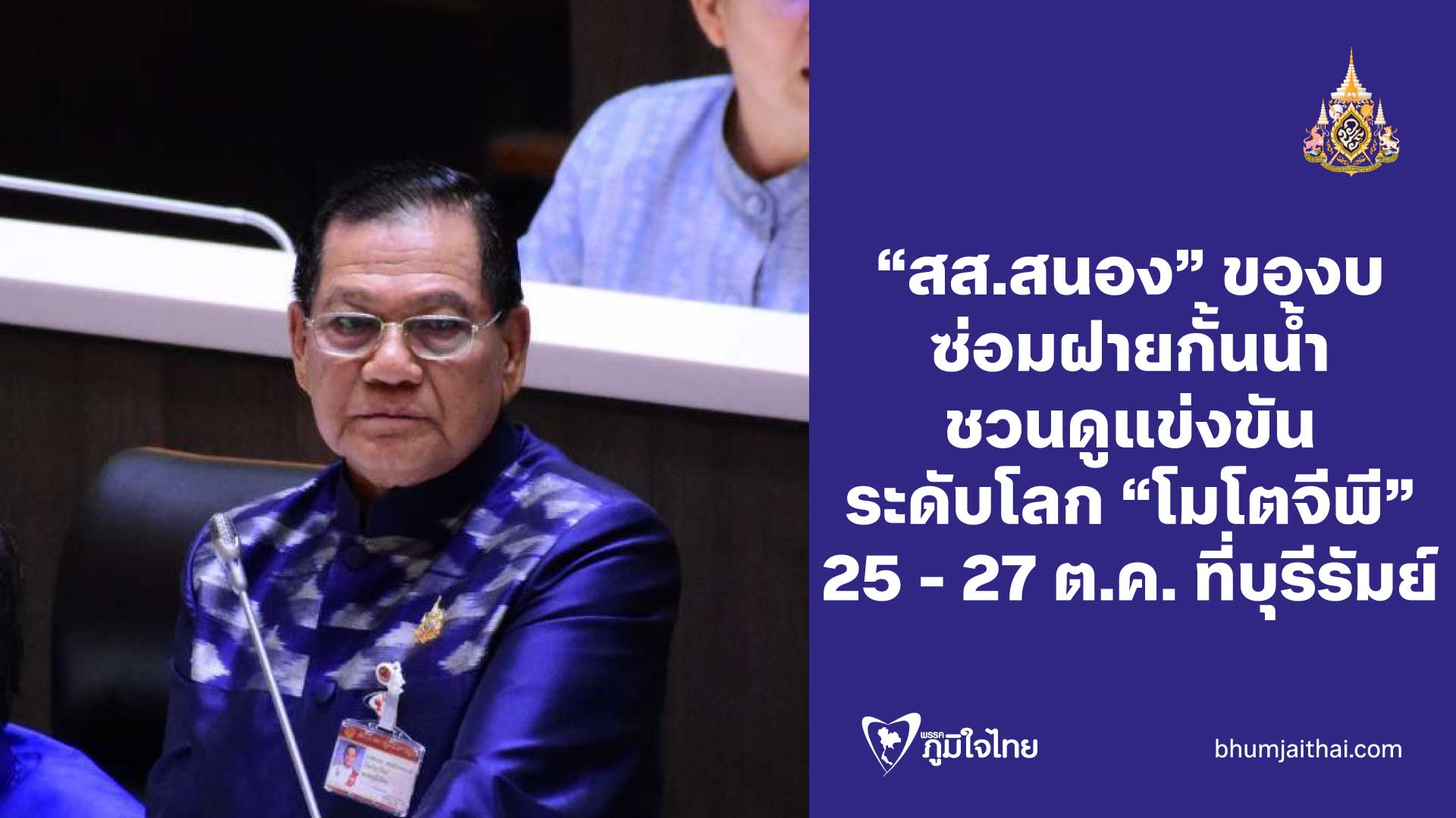"สส.สนอง" ของบ ซ่อมฝายกั้นน้ำ ชวนดูแข่งขัน ระดับโลก "โมโตจีพี" 25 - 27 ต.ค. ที่บุรีรัมย์