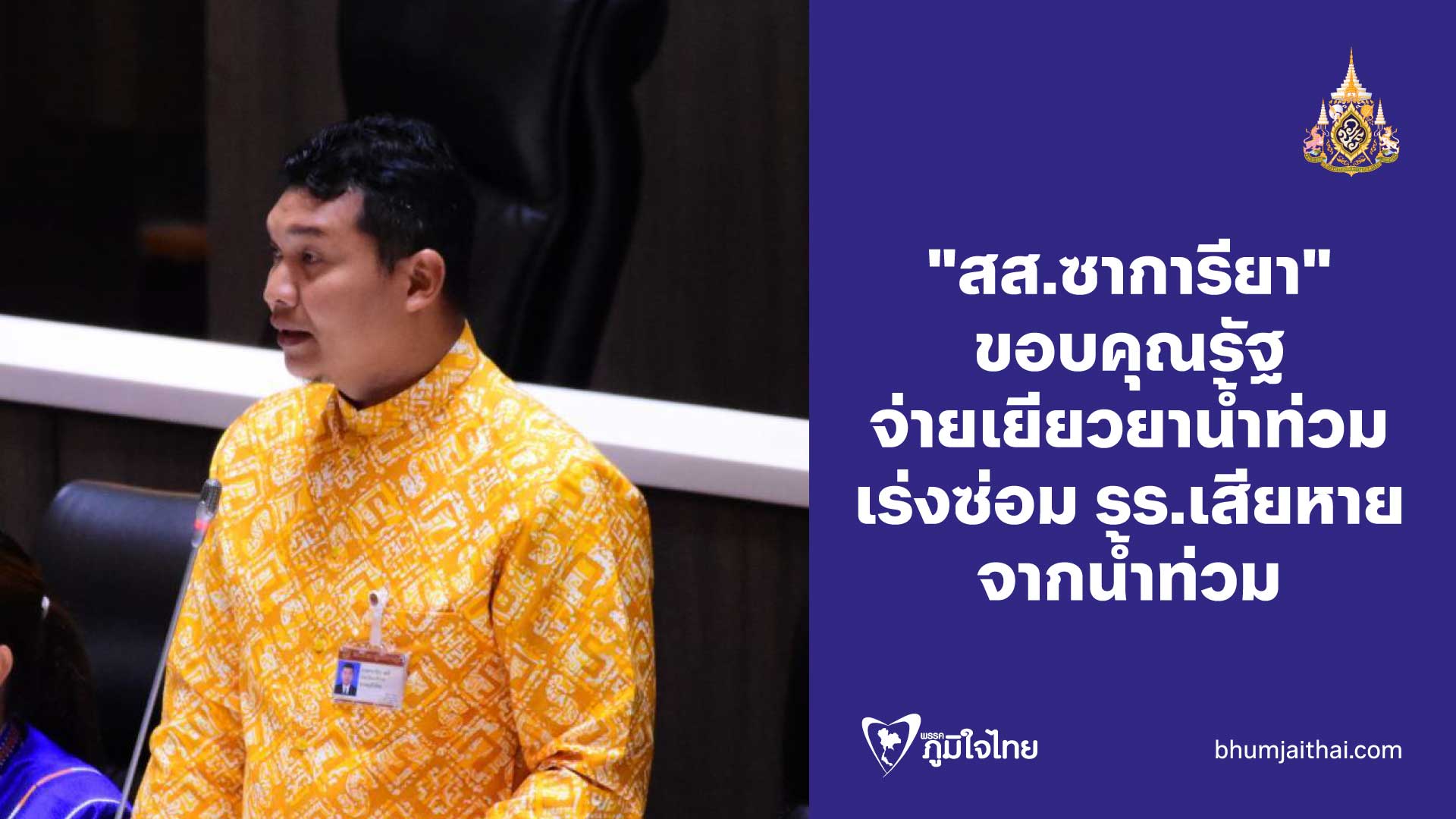 วันที่ 24 ตุลาคม 2567 นายซาการียา สะอิ สมาชิกสภาผู้แทนราษฎรจังหวัดนราธิวาส พรรคภูมิใจไทย หารือประธานสภาผู้แทนราษฎร ว่า ก่อนอื่นต้องขอเป็นกําลังใจให้กับผู้ได้รับผลกระทบใน1-2 เดือนที่ผ่านมาจากน้ำท่วม และขอบคุณรัฐบาลที่มอบการเยียวยาแบบเหมาจ่ายตามมติ ครม.ในวันที่ 8 ตุลาคมที่ผ่านมาอย่างไรก็ตามได้หารือสภาหลายครั้งเกี่ยวเยียวยาน้ำท่วมใหญ่เมื่อปลายปี 66 ในพื้นที่ 3 จังหวัดชายแดนภาคใต้ซึ่งมีความรุนแรงไม่น้อยไปกว่าที่อื่น ฝากท่านประธานไปยังนายกรัฐมนตรี คณะรัฐมนตรี ดูแลทุกพื้นที่ให้เหมือนกันด้วย อย่าได้เลือกที่รักมักที่ชัง