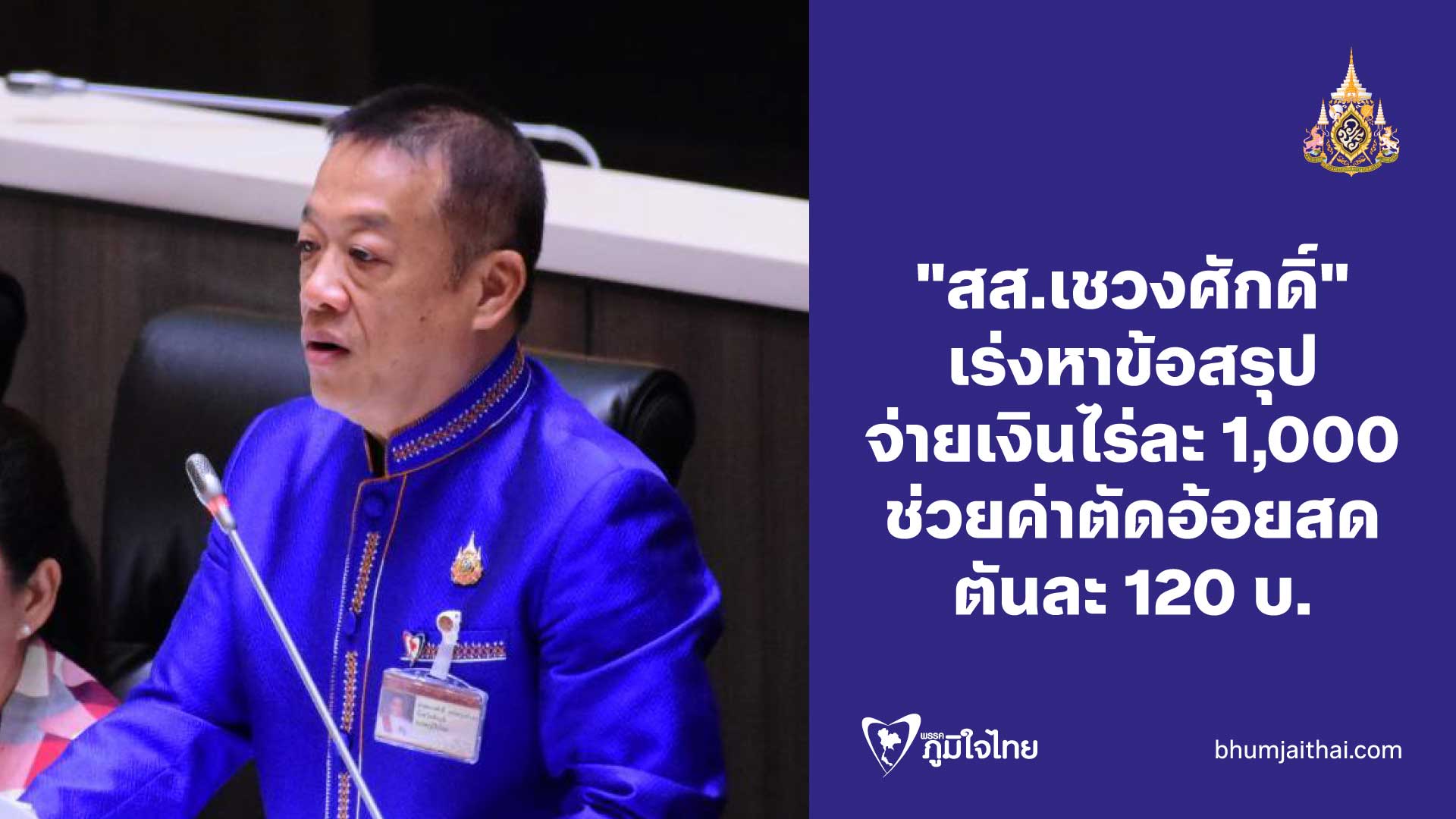 วันที่ 25 ตุลาคม 2567 นายเชวงศักดิ์ เร่งไพบูลย์วงษ์ สมาชิกสภาผู้แทนราษฎรจังหวัดชัยภูมิ เขต 6 พรรคภูมิใจไทย หารือประธานสภาผู้แทนราษฎรถึงปัญหาความเดือดร้อนของชาวนาผ่านไปยังรัฐบาล กรณีที่รัฐบาลใช้มาตรการปุ๋ยคนละครึ่งแทนการจ่ายเงินช่วยค่าเก็บเกี่ยวไร่ละ 1,000 บาทในฤดูการผลิต 2567/2568 ซึ่งชาวนาไม่เห็นด้วยกับปุ๋ยคนละครึ่ง แต่อยากให้รัฐบาลกลับมาใช้มารการช่วยเหลือค่าเก็บเกี่ยวไร่ละ 1,000 บาทเหมือนฤดูกาลที่ผ่านมา ขณะนี้ชาวนาทั่วประเทศกว่า 4 ล้านครอบครัวตั้งตารอการพิจารณาของรัฐบาล เนื่องจากใกล้ฤดูกาลเก็บเกี่ยว อีกทั้งปีนี้ราคาข้าวก็มีแนวโน้มตกต่ำลง ดังนั้นการจ่ายเงินช่วยค่าเก็บเกี่ยว จึงน่าจะเป็นการช่วยลดต้นทุนให้กับพี่น้องชาวนาได้ และงินจะถูกนำไปหมุนเวียนทางเศรษฐกิจทำให้เกิดผลดีต่อการเติบโตทางเศรษฐกิจของประเทศด้วย
