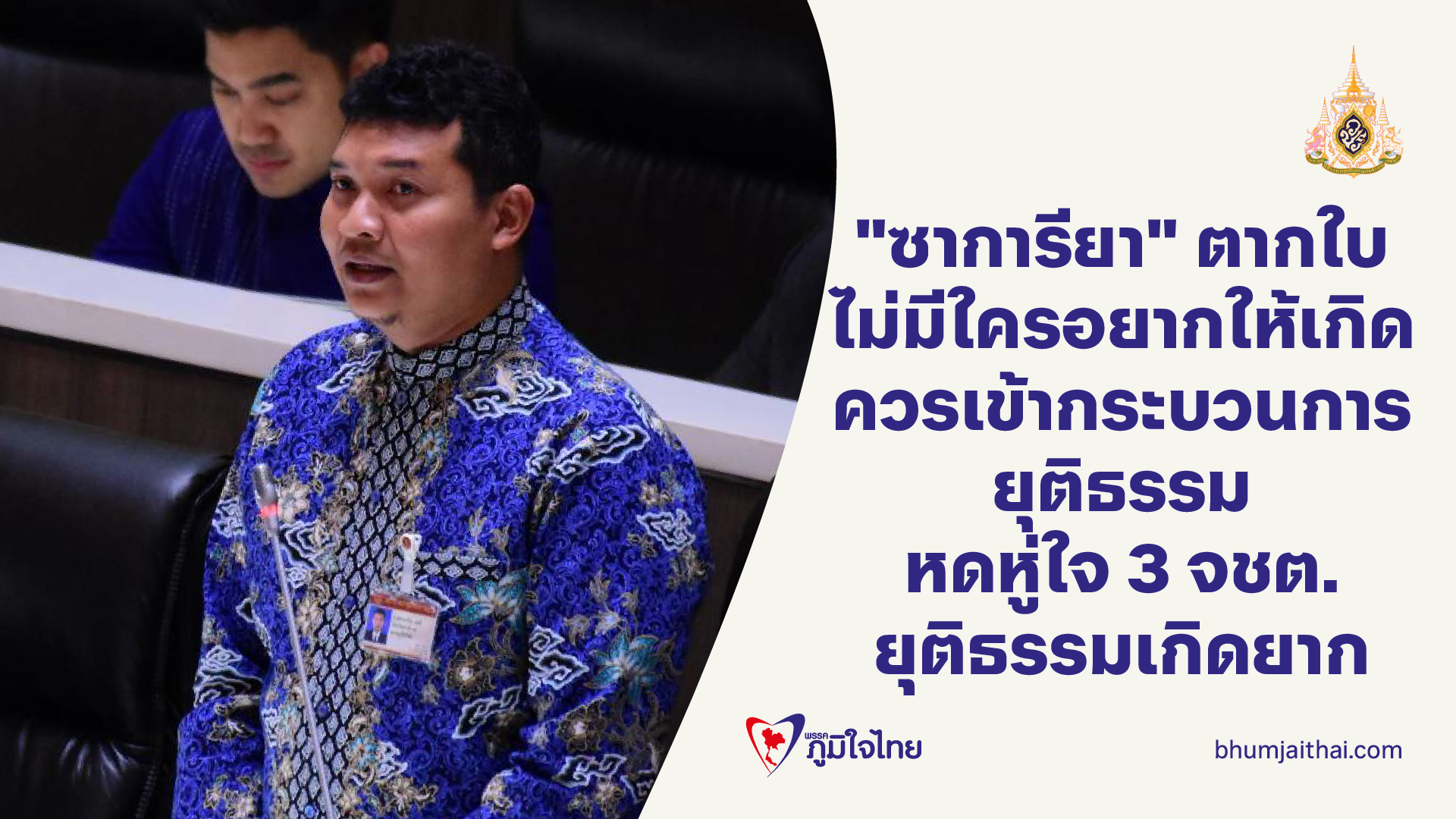 สส.ซาการียา อภิปรายต่อว่า ผมขอนำคําของภรรยาผู้ที่เสียชีวิตในเหตุการณ์ตากใบมาสั้นๆ คดีความจะหมดอายุความแล้วเราต้องจับมือกัน เราต้องกล้า อยากรู้ว่ายังมีมั๊ยความยุติธรรมสําหรับชาวบ้านอย่างเราจะสู้ได้มั๊ยจนวินาทีสุดท้าย เราไม่อยากให้ดูว่าเราเป็นคนผิด คนอื่นมองว่าเราผิดไปที่ชุมนุม อยากล้างสิ่งนี้ด้วยความยุติธรรมในครั้งนี้ นี่คือคําของภรรยาผู้เสียชีวิตในเหตุการณ์ตากใบพูด เขาไม่ได้ฟ้องร้องเพื่อที่จะเอาอะไร แต่ฟ้องเพื่อที่จะให้ตัวเองหรือคนที่ไปชุมนุมได้เกิดความบริสุทธิ์ใจว่าคนที่ไปเป็นผู้บริสุทธิ์