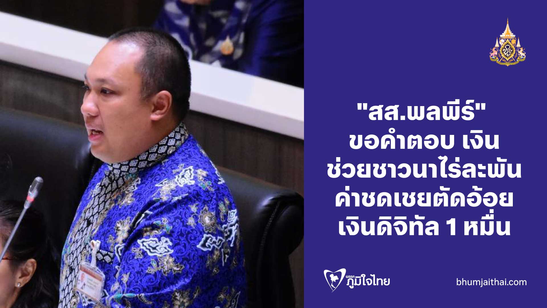 "สส.พลพีร์" หารือสภาฯ ติดตั้งไฟจราจรและซ่อมแซมถนนบริเวณวงเวียนทับสวาย ขอคำตอบเงินช่วยชาวนาไร่ละ 1,000 บาท- ค่าชดเชยตัดอ้อยตันละ 120 บาท -เงินดิจิทัล 1 หมื่นสำหรับกลุ่มที่เหลือ