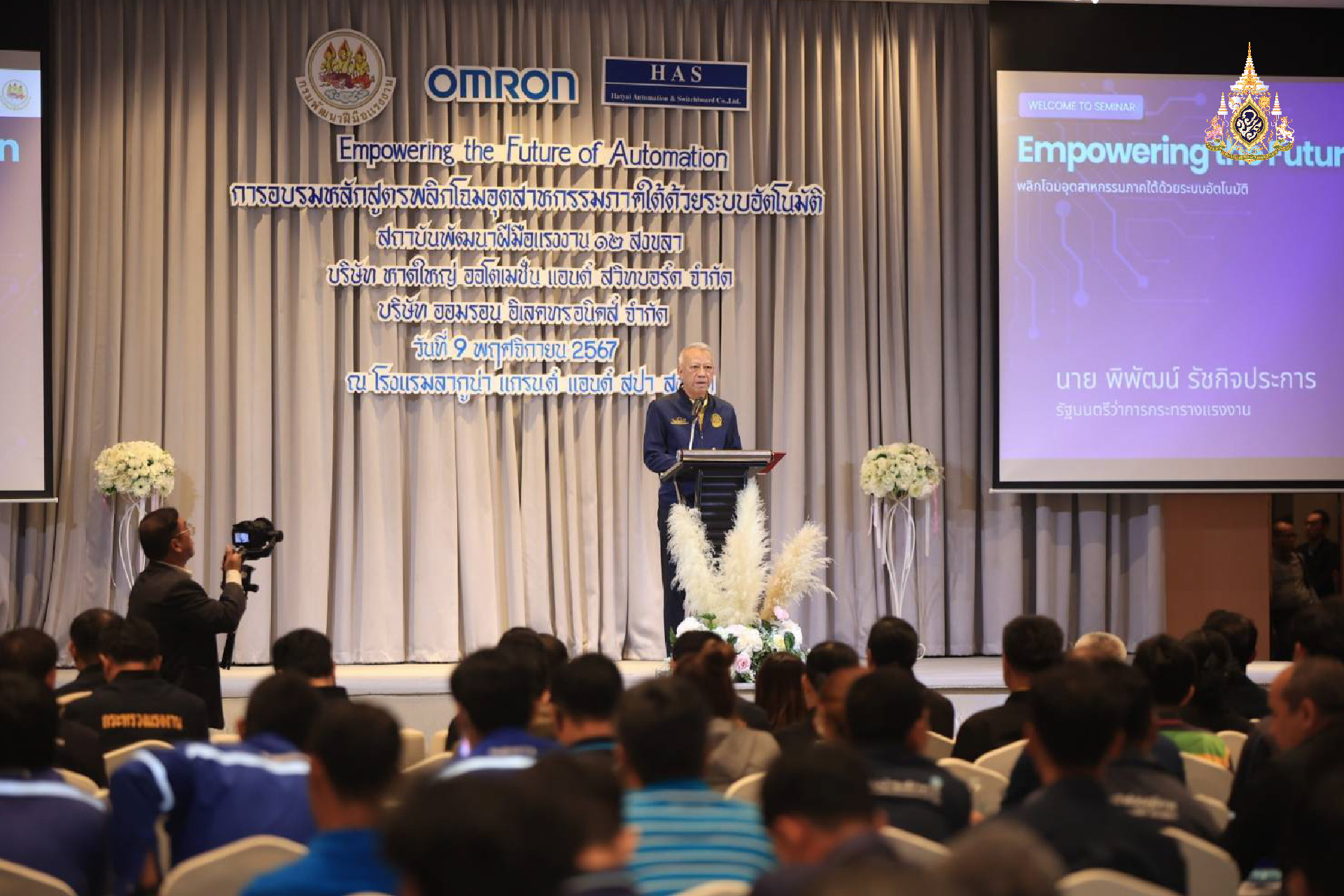 วันที่ 9 พฤศจิกายน 2567 นายพิพัฒน์ รัชกิจประการ รัฐมนตรีว่าการกระทรวงแรงงาน เป็นประธานในพิธีเปิดการอบรม สาขา Empowering the Future of Automation (พลิกโฉมอุตสาหกรรมด้วยระบบอัตโนมัติ) รุ่นที่ 1/2568 ณ โรงแรมลากูน่า แกรนด์ โฮเทล แอนด์ สปา สงขลา อำเภอเมือง จังหวัดสงขลา โดยมี รองผู้ว่าราชการจังหวัด จิรวัตร์ มณีโชติ ให้การต้อนรับ โดยมีนายบุญสงค์ ทัพชัยยุทธ ปลัดกระทรวงแรงงาน นางจิรวรรณ สุตสุนทร รองอธิบดีกรมพัฒนาฝีมือแรงงาน ผู้บริหารกระทรวงแรงงาน หัวหน้าส่วนราชการของจังหวัดสงขลา ผู้บริหารบริษัท ออมรอม อิเล็กทริค จำกัด และบริษัท หาดใหญ่ ออโตเมชั่น แอนด์ สวิทช์บอร์ด จำกัด ร่วมเป็นเกียรติในงาน