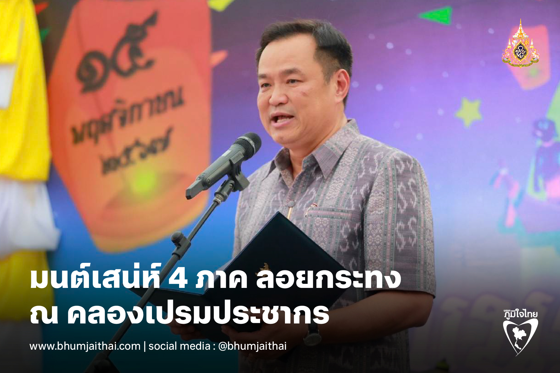 "ขอชื่นชมกรุงเทพมหานคร รวมถึงภาคีเครือข่าย ที่ได้จัดกิจกรรมการแข่งขันเรือยาวประเพณีลอยกระทงฯ มีการประสานความร่วมมือจากภาครัฐ ภาคเอกชน ภาคประชาชน แสดงให้เห็นถึงการรวมพลังภาคีเครือข่าย ซึ่งนอกจากจะได้ฟื้นฟู อนุรักษ์วัฒนธรรม ประเพณีแล้วยังเป็นการกระตุ้นเศรษฐกิจบริเวณริมคลองเปรม พี่น้องประชาชนได้มีความสุข สนุกสนาน รื่นเริง" นายอนุทิน กล่าว
