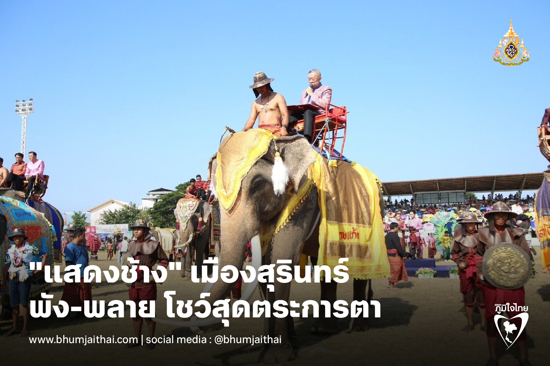 วันนี้ (16 พฤศจิกายน 2567) เวลา 8.20 น. นายอนุทิน ชาญวีรกูล รองนายกรัฐมนตรี มอบหมายให้ พลตำรวจเอกเพิ่มพูน ชิดชอบ รัฐมนตรีว่าการกระทรวงศึกษาธิการ (รมว.ศธ.) เป็นประธานในพิธีเปิดงานแสดงช้าง ณ สนามแสดงช้างสุรินทร์ อำเภอเมือง จังหวัดสุรินทร์