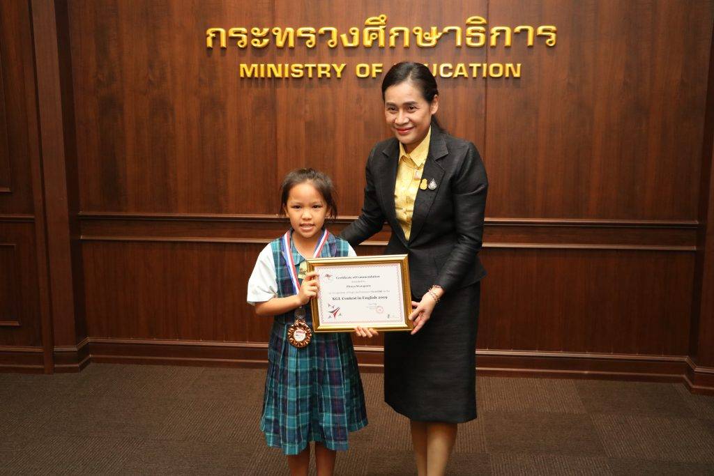 วันที่ 5 กันยายน 2562 ดร.กนกวรรณ วิลาวัลย์ รัฐมนตรีช่วยว่าการกระทรวงศึกษาธิการ มอบเหรียญรางวัลให้นักเรียนที่ชนะการแข่งขัน KGL Contest in English โดยมีนายมณฑล ภาคสุวรรณ์ รองเลขาธิการคณะกรรมการส่งเสริมการศึกษาเอกชน เป็นผู้กล่าวรายงาน ณ ห้องประชุมราชวัลลภ กระทรวงศึกษาธิการ