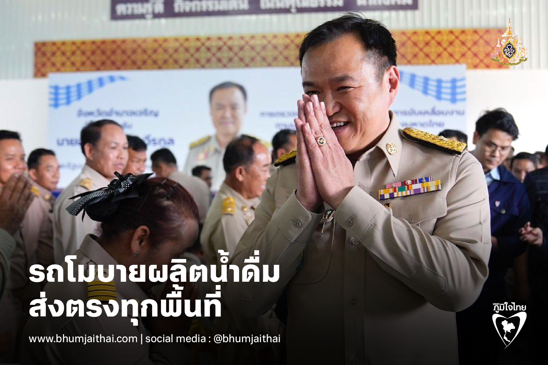 “วันนี้ สิ่งที่ต้องเน้นย้ำ คือเรื่องของน้ำดื่มเพื่อประชน นี่เป็นนโยบายที่เราศึกษามาร่วมปีแล้ว แนวทางของเราคือ การส่งรถโมบาย เพื่อการผลิตน้ำดื่มลงทุกพื้นที่ทั่วไทย นี่คือ เทคโนโลยีใหม่ ที่เราต้องนำเข้ามาใช้ เพื่อลดภาระของประชาชน เป็นรูปแบบหนึ่งที่ภาครัฐมีกำลังจัดสรรให้ชาวบ้าน ราคาน้ำดื่มมีราคา และชาวบ้านต้องซื้อหา เป็นภาระค่าใช้จ่าย จากนี้เราต้องเข้าไปช่วยบรรเทา ขอมอบให้การประปาส่วนภูมิภาคเข้าไปเป็นแม่งาน ประสานหน่วยงานที่เกี่ยวข้อง และต้องการเห็นความเป็นรูปธรรมของนโยบาย”