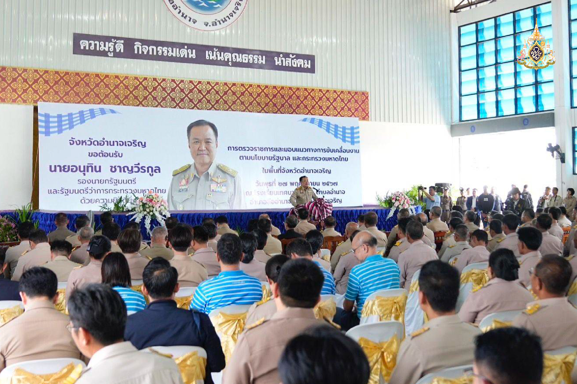 27 พฤศจิกายน 2567 ที่โรงเรียนเทศบาลอำนาจ อำเภอ ลือจังหวัด จังหวัด อำนาจเจริญ นายอนุทิน ชาญวีรกูล รองนายกรัฐมนตรี และรัฐมนตรีว่าการกระทรวงมหาดไทย ได้เดินทางมาตรวจราชการ พร้อมด้วยคณะผู้บริหาร โดยมีการมอบนโยบายแก่ข้าราชการ และเจ้าหน้าที่ ที่มารับฟัง