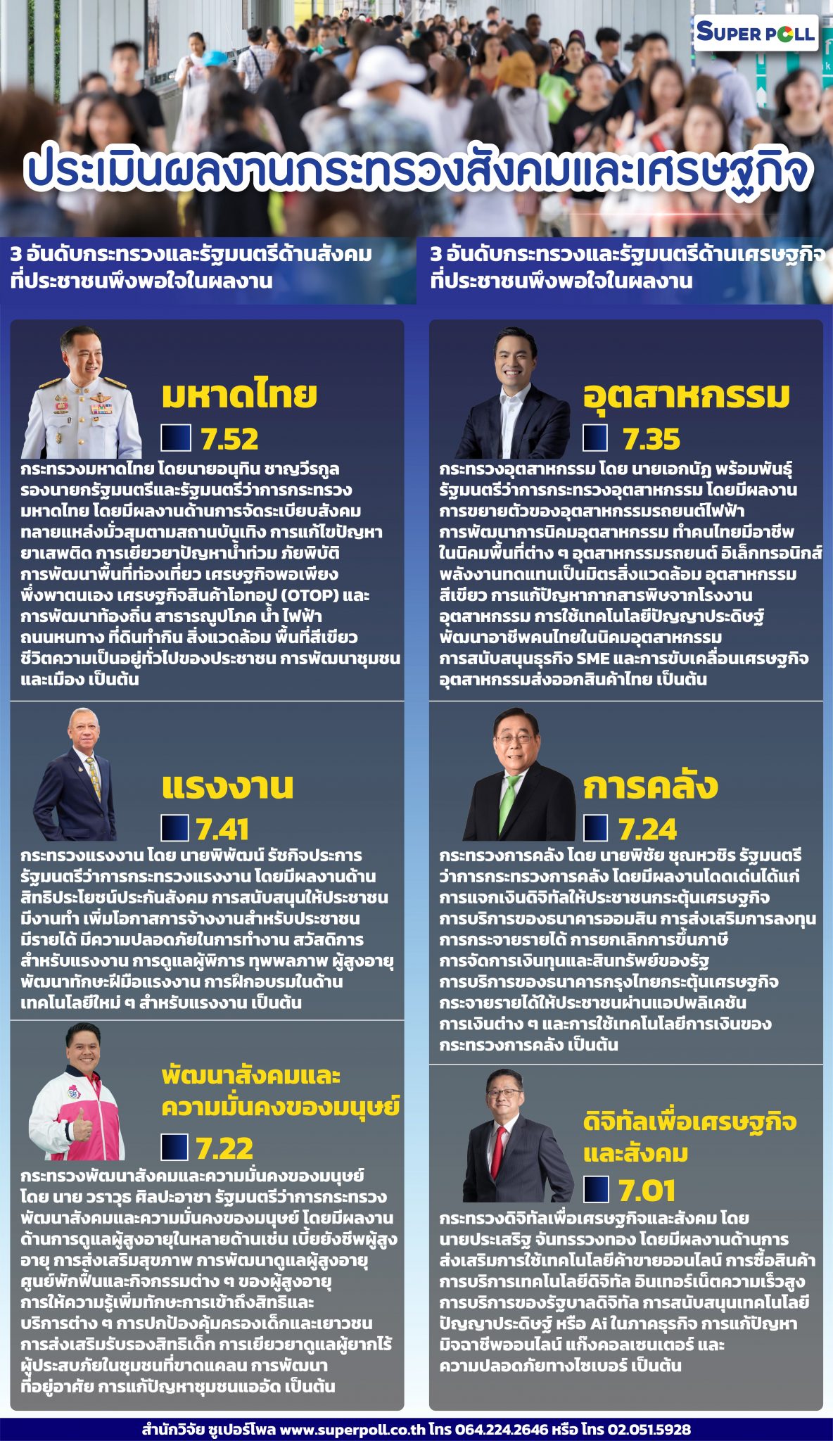 สำนักวิจัยซูเปอร์โพล รายงานผลสำรวจเรื่อง “ประเมินผลงานกระทรวงสังคมและเศรษฐกิจ” กรณีศึกษาตัวอย่างประชาชนทุกสาขาอาชีพทั่วประเทศ ดำเนินโครงการ รวมจำนวนตัวอย่างในการวิเคราะห์ทางสถิติทั้งสิ้น จำนวนทั้งสิ้น 1,156ตัวอย่าง ระหว่างวันที่ 10 – 14 ธันวาคม พ.ศ.2567ที่ผ่านมา โดยเมื่อถามถึงรัฐมนตรีประจำกระทรวงด้านสังคมที่ประชาชนพึงพอใจ อันดับแรก พบว่า กระทรวงมหาดไทยโดยนายอนุทิน ชาญวีรกูล รองนายกรัฐมนตรีและรัฐมนตรีว่าการกระทรวงมหาดไทยได้คะแนนสูงสุดอันดับหนึ่ง เมื่อคะแนนเต็ม 10 คะแนน ได้ 7.52 คะแนน โดยมีผลงานด้านการจัดระเบียบสังคม ทลายแหล่งมั่วสุมตามสถานบันเทิง การแก้ไขปัญหายาเสพติด การเยียวยาปัญหาน้ำท่วม ภัยพิบัติ การพัฒนาพื้นที่ท่องเที่ยว เศรษฐกิจพอเพียง พึ่งพาตนเอง เศรษฐกิจสินค้าโอทอป (OTOP) และการพัฒนาท้องถิ่น สาธารณูปโภค น้ำ ไฟฟ้า ถนนหนทาง ที่ดินทำกิน สิ่งแวดล้อม พื้นที่สีเขียว ชีวิตความเป็นอยู่ทั่วไปของประชาชน การพัฒนาชุมชนและเมือง เป็นต้น