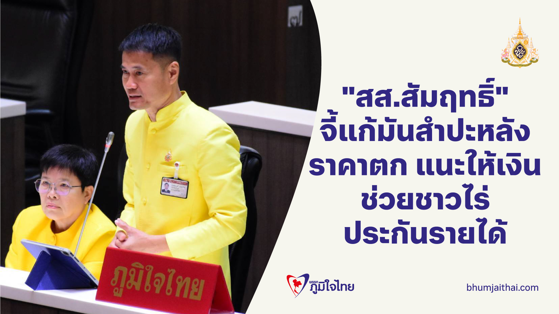 "สส.สัมฤทธิ์" จี้รัฐ แก้ไขปัญหาราคามันสําปะหลังตกต่ำ จาก 4 บาท ลงเหลือ 2.30-2.50 บาท แนะให้เงินช่วยชาวไร่-ประกันรายได้ และส่งเสริมผลิตภัณฑ์จากมันสําปะหลังใช้ผสมอาหารสัตว์ และผลิตเอทานอลจากมันสําปะหลัง
