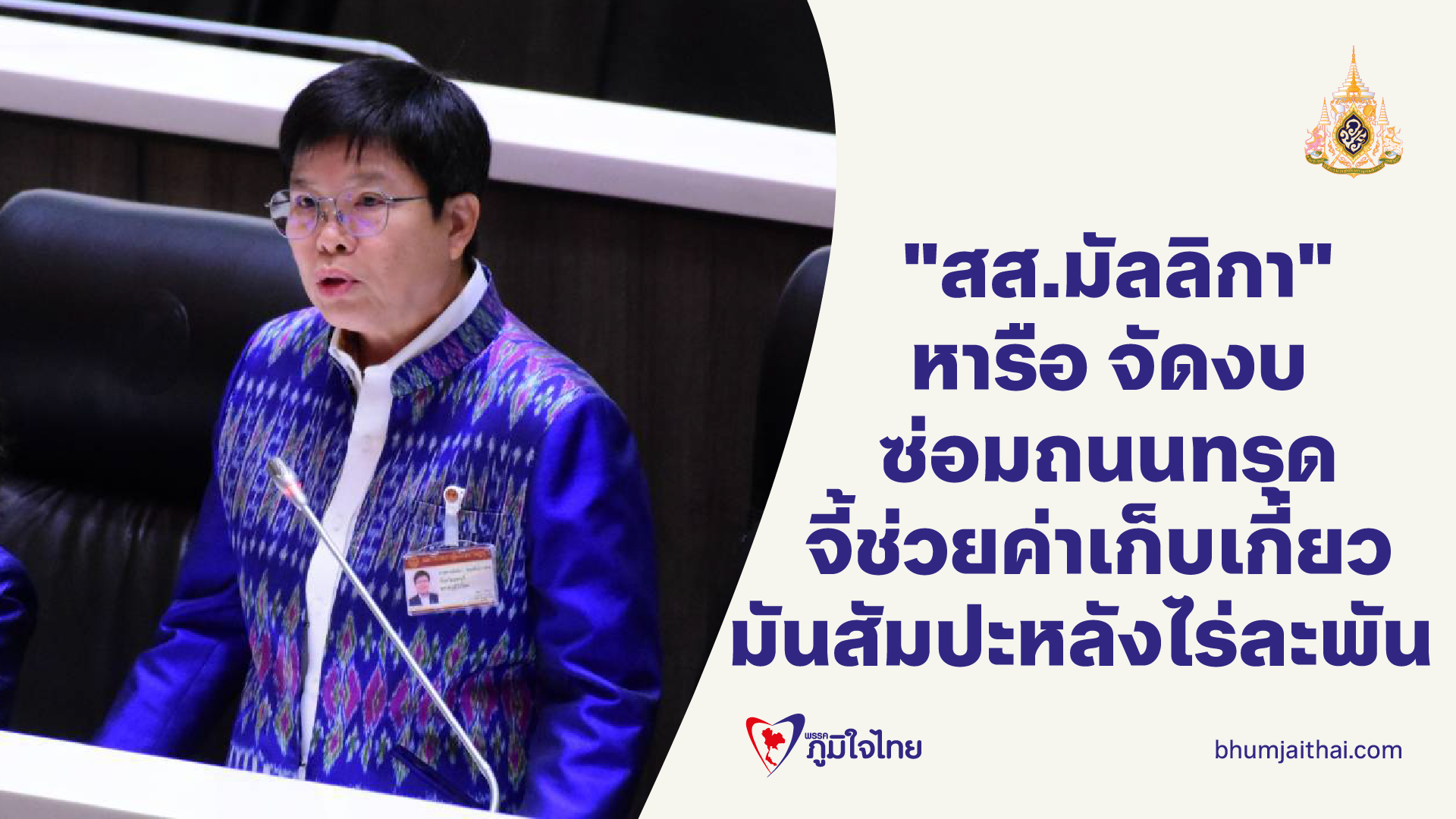 "สส.มัลลิกา" หารือสภาฯ จัดงบซ่อมถนน ทล.3196 ผิวจราจรแตก ทรุดตัว จี้รัฐช่วยเหลือค่าเก็บเกี่ยวมันสำปะหลังไร่ละ 1,000 บาท ชวนแต่งชุดไทยเที่ยวงาน "แผ่นดินสมเด็จพระนารายณ์" พร้อมของบให้เมืองรองกระตุ้นท่องเที่ยว