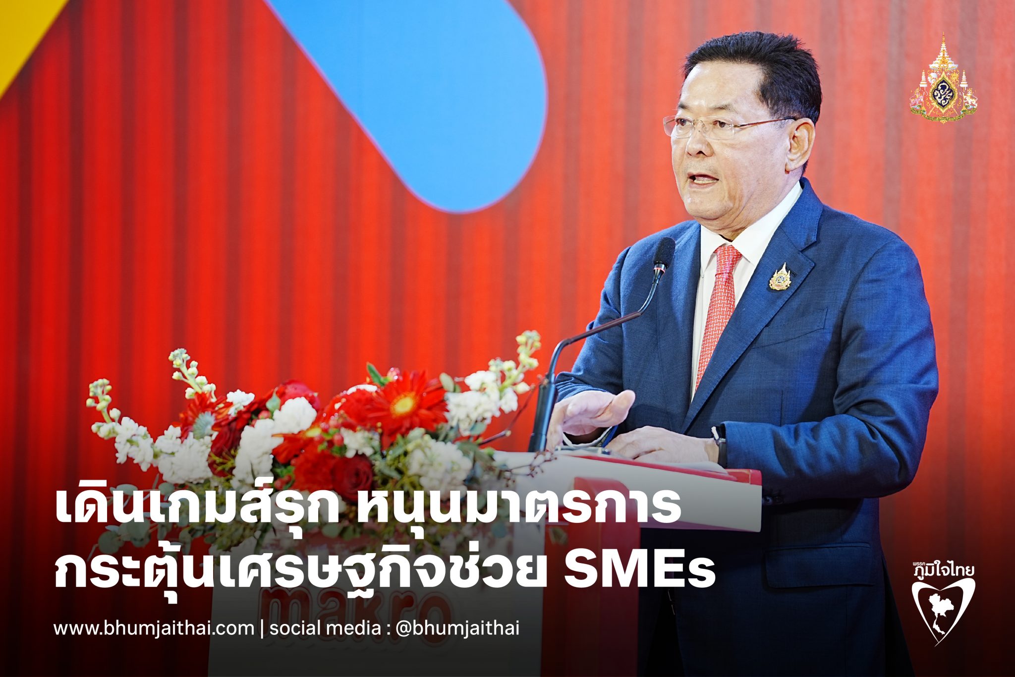 วันที่ 23 มกราคม 2568 ณ แมคโคร-โลตัสมอลล์ สาขาสาทร นายนภินทร ศรีสรรพางค์ รัฐมนตรีช่วยว่าการกระทรวงพาณิชย์ เปิดเผยว่า SMEs ถือเป็นหัวใจสำคัญของเศรษฐกิจไทย เป็นหน่วยเศรษฐกิจขนาดเล็กที่มีความสำคัญระดับประเทศ นโยบายสนับสนุน SMEs ของรัฐบาลและกระทรวงพาณิชย์เป็นหนึ่งในมาตรการกระตุ้นเศรษฐกิจประเทศให้เติบโตอย่างแข็งแกร่ง โดยรัฐบาลมีเป้าหมายเพื่อช่วยให้ SMEs สามารถเข้าถึงแหล่งเงินทุน ขยายตลาด และเพิ่มขีดความสามารถในการแข่งขัน และเป็นกลไกในการขับเคลื่อนเศรษฐกิจประเทศ รวมทั้งเพิ่ม GDP SME จาก 35.2% เป็น 40% ในปี 2570