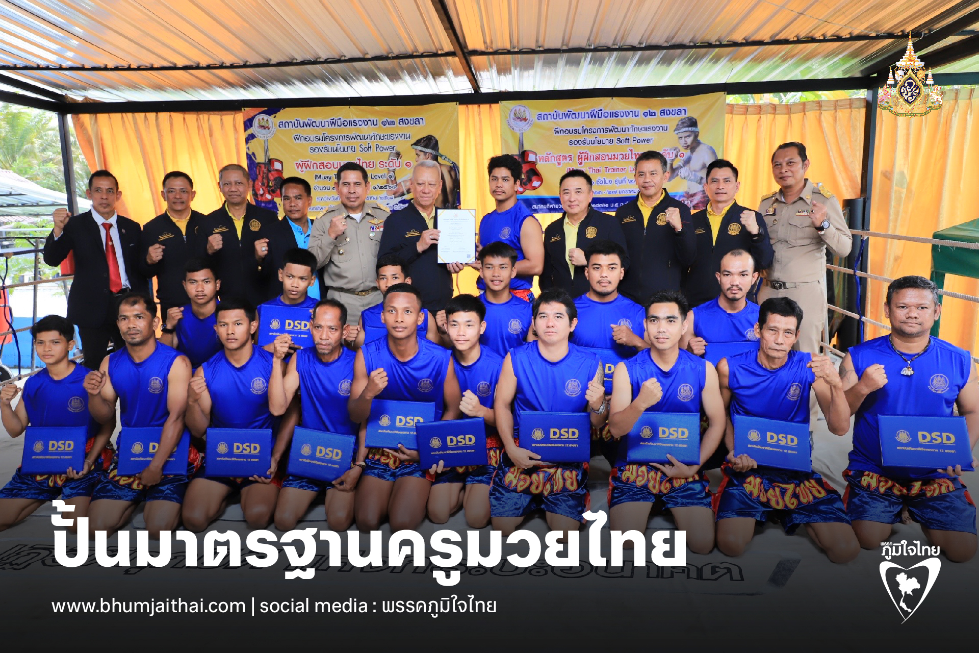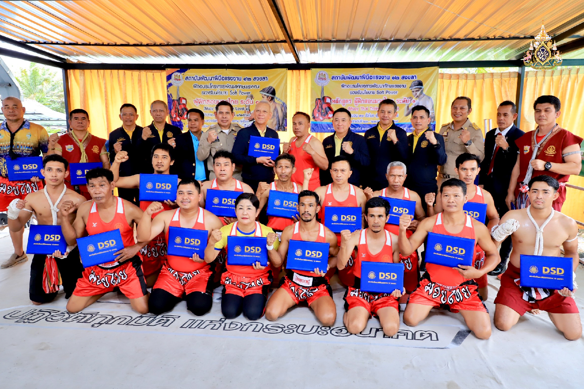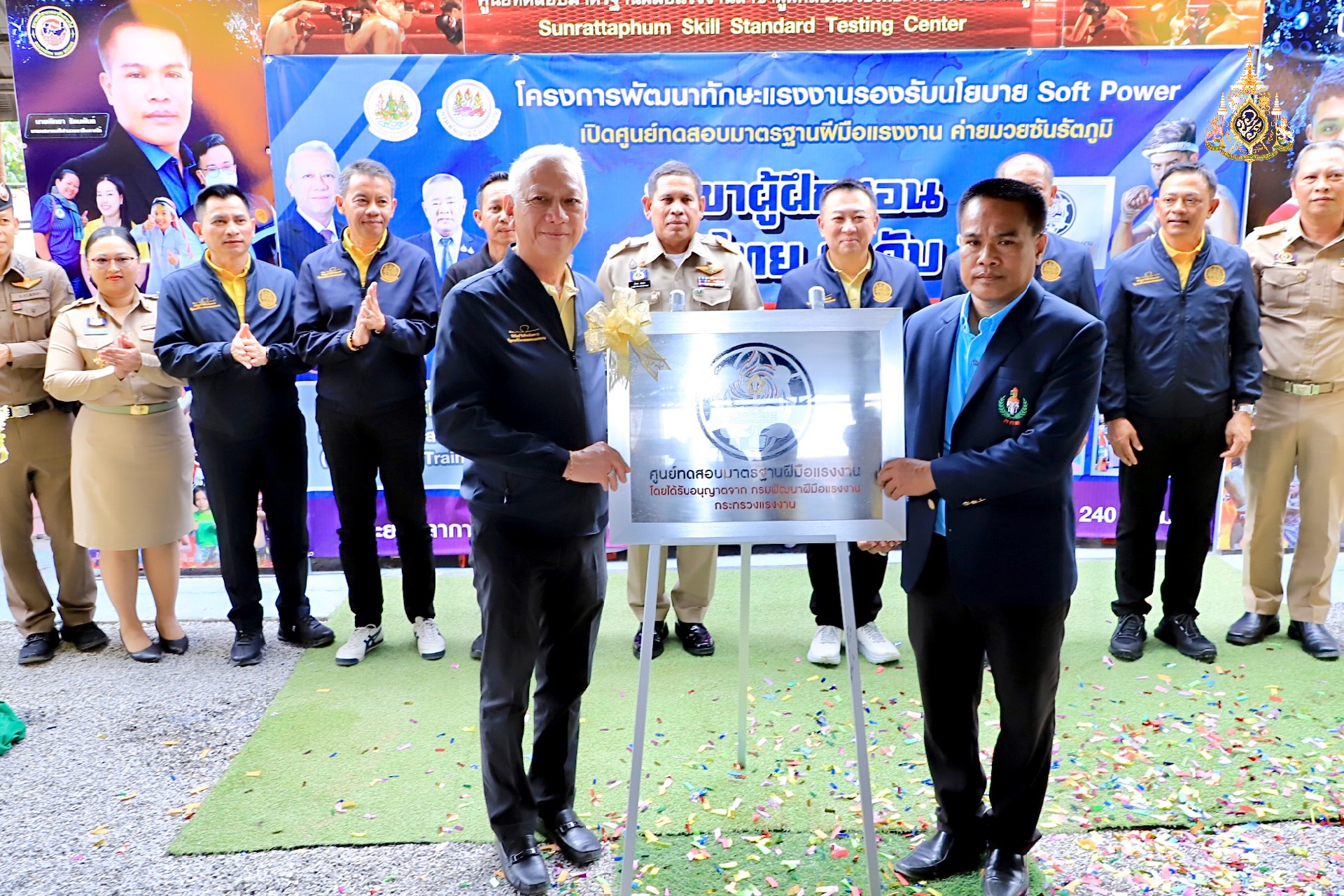 วันที่ 27 มกราคม 2568 นายพิพัฒน์ รัชกิจประการ รัฐมนตรีว่าการกระทรวงแรงงาน เป็นประธานพิธีมอบป้ายศูนย์ทดสอบมาตรฐานฝีมือแรงงาน สาขาผู้ฝึกสอนมวยไทย ระดับ 1 และมอบวุฒิบัตรให้ผู้ผ่านการฝึกอบรม จำนวน 60 คน พร้อมปิดการฝึกอบรม โดยมี นายสังคม เกิดก่อ รองผู้ว่าราชการจังหวัดสงขลา กล่าวต้อนรับ นายเดชา พฤกษ์พัฒนรักษ์ อธิบดีกรมพัฒนาฝีมือแรงงาน กล่าวรายงาน พร้อมด้วย นายภุชงค์ วรศรี ประจำสำนักเลขาธิการนายกรัฐมนตรี ปฏิบัติหน้าที่ประจำกระทรวงแรงงาน นายพิเชษฐ์ ทองพันธ์ ผู้ตรวจราชการกระทรวงแรงงาน ผู้บริหารกระทรวงแรงงาน นายพิทยา รัตนพันธ์ นายกสมาคมกีฬามวยอาชีพภาคใต้ นาวาอากาศเอก อธิคุณ คงมี อดีตผู้อำนวยการ องค์การบริหารการพัฒนาพื้นที่พิเศษเพื่อการท่องเที่ยวอย่างยั่งยืน และหัวหน้าส่วนราชการสังกัดกระทรวงแรงงานร่วมเป็นเกียรติ ณ ค่ายมวยซันรัตภูมิ อำเภอรัตภูมิ จังหวัดสงขลา
