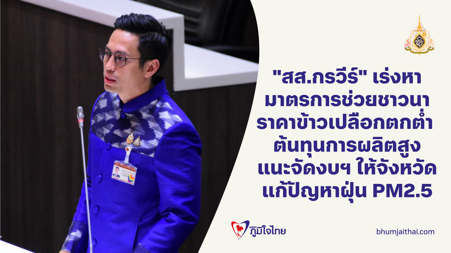 "สส.กรวีร์" เร่งหา มาตรการช่วยชาวนา ราคาข้าวเปลือกตกต่ำ ต้นทุนการผลิตสูง แนะจัดงบฯ ให้จังหวัด แก้ปัญหาฝุ่น PM2.5