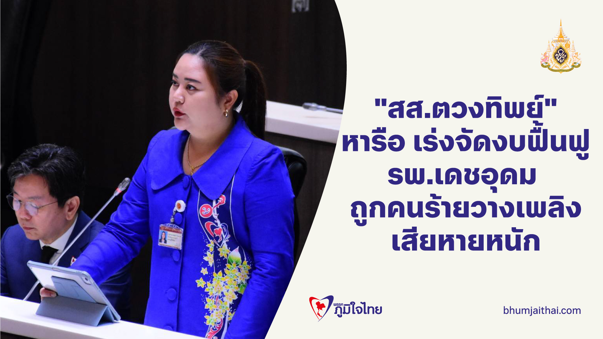"สส.ตวงทิพย์" เรียกร้องรัฐบาล และ ก.สาธารณสุข เร่งจัดงบประมาณฟื้นฟู รพ.สมเด็จพระยุพราชเดชอุดม พร้อมจัดหาอุปกรณ์ทางการแพทย์ทดแทน หลังถูกคนร้ายวางเพลิงเสียหายหลายสิบล้านบาท