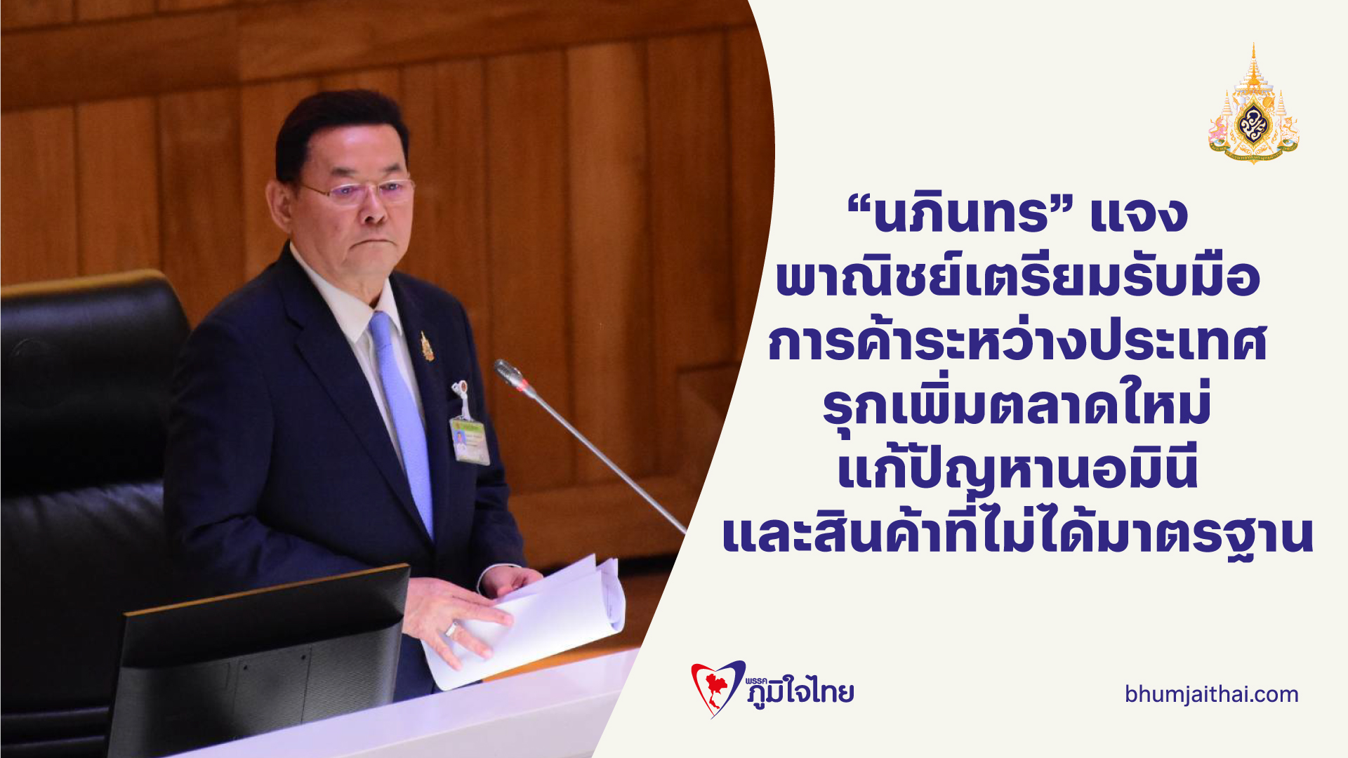 “นภินทร” แจงสภา พาณิชย์เตรียมรับมือสถานการณ์การค้าระหว่างประเทศ ทั้งเจรจาตลาดหลัก รุกเพิ่มตลาดใหม่ ดูแลเกษตรกร ผู้ประกอบการ SMEs และประชาชนในประเทศ พร้อมเน้นมาตรการแก้ไขปัญหานอมินี และสินค้าที่ไม่ได้มาตรฐาน อย่างเข้มข้น