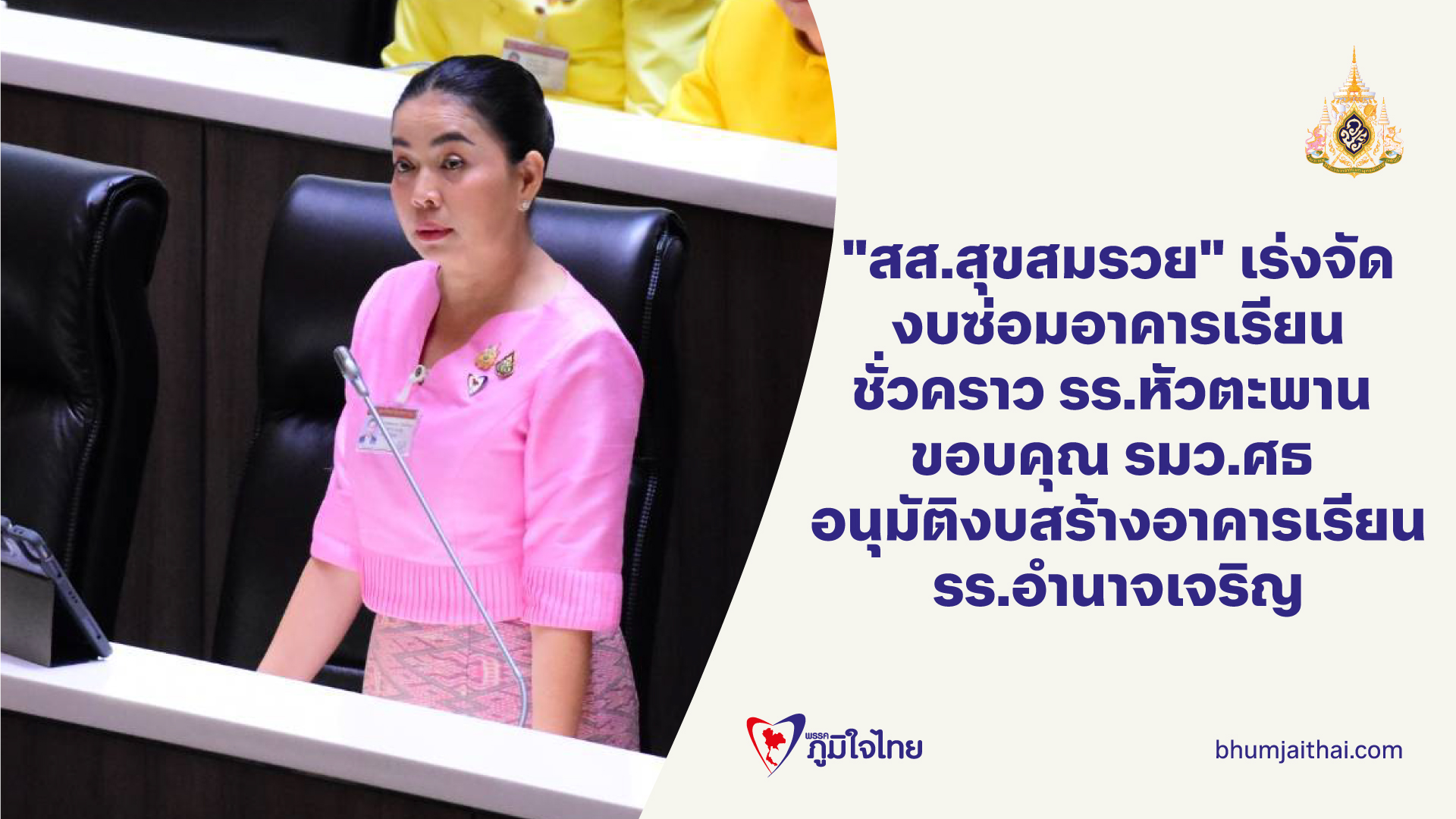 "สส.สุขสมรวย" หารือสภาฯ เร่งรัดหน่วยงานที่เกี่ยวข้อง จัดงบฯ ซ่อมแซมอาคารเรียนชั่วคราว รร.หัวตะพาน พร้อมขอบคุณ "พล.ต.อ.เพิ่มพูน" อนุมัติงบสร้างอาคารเรียนทดแทน หลังเก่า รร.อำนาจเจริญ ซึ่งขณะนี้อยู่ระหว่างการก่อสร้าง