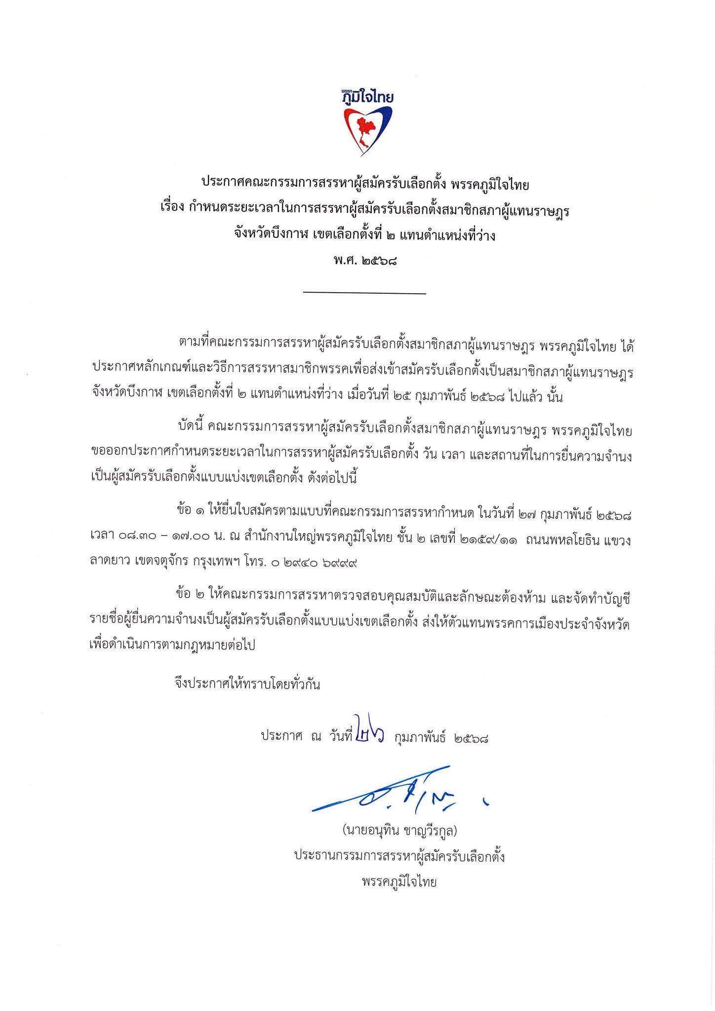 26 กุมภาพันธ์ 2568 เวลา 10:10ประกาศคณะกรรมการสรรหาผู้สมัครรับเลือกตั้ง พรรคภูมิใจไทย เรื่อง กำหนดระยะเวลาในการสรรรหาผู้สมัครรับเลือกตั้งสมาชิกสภาผู้แทนราษฎร จังหวัดบึงกาฬ เขตเลือกตั้งที่ ๒ แทนตำแหน่งที่ว่าง พ.ศ. ๒๕๖๘ แชร์บทความนี้: