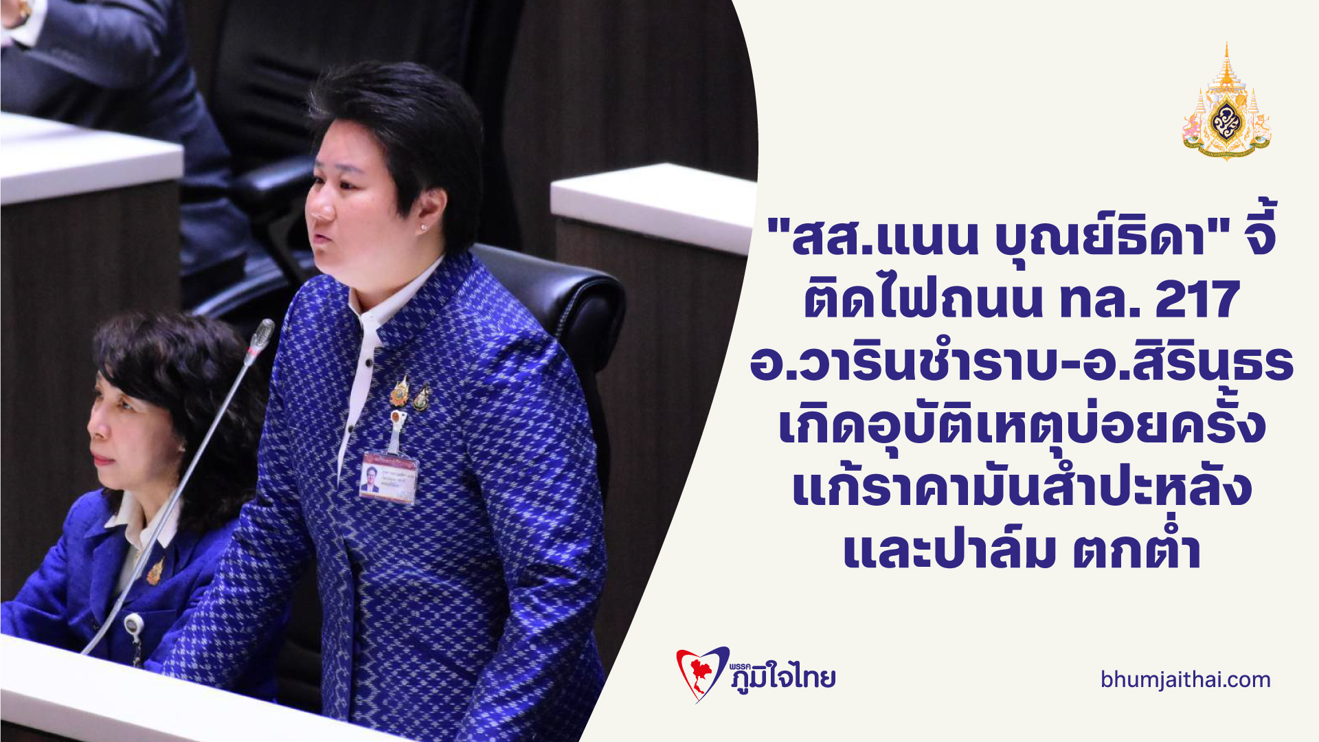 "สส.แนน บุณย์ธิดา" จี้ ติดไฟถนน ทล. 217 อ.วารินชำราบ-อ.สิรินธร เกิดอุบัติเหตุบ่อยครั้ง แก้ราคามันสำปะหลัง และปาล์ม ตกต่ำ