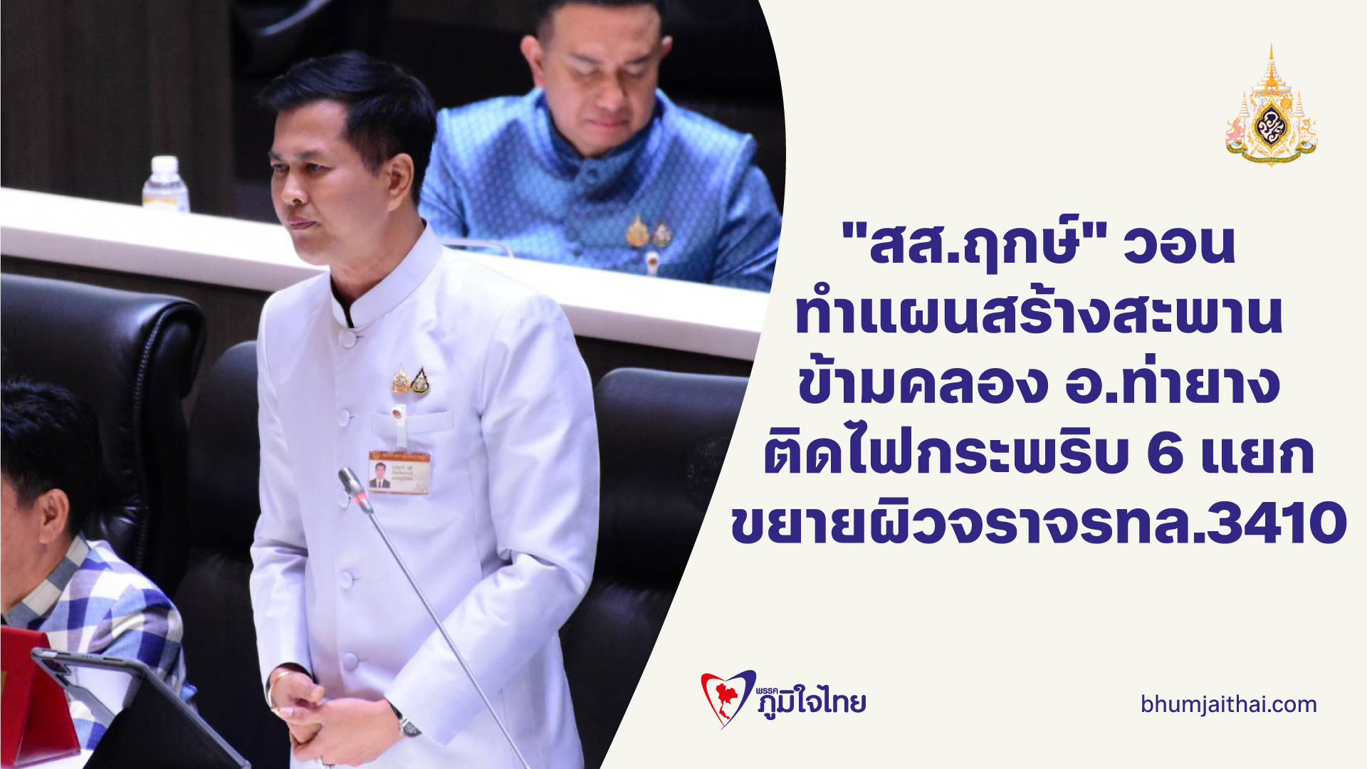 "สส.ฤกษ์" วอน สำรวจและจัดทำแผน สร้างสะพานข้ามคลองชลประทานในอ.ท่ายาง เพิ่มอีกหนึ่งช่องทาง พร้อมติดไฟกระพริบ 6 แยก ขยายผิวจราจรถนน ทล.3410 และติดไฟจราจรแยกชุมชนบ้านหนองแจง