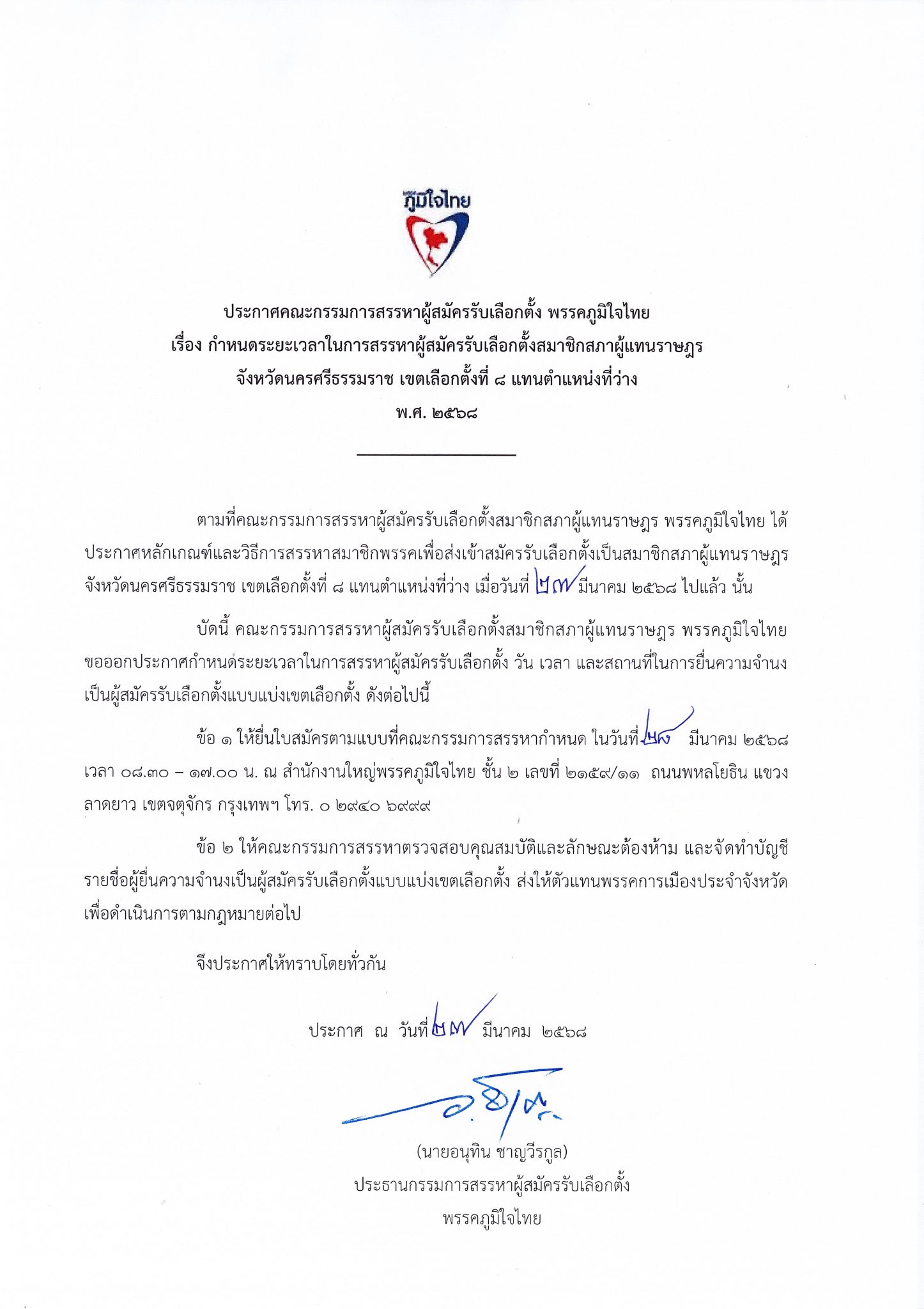 27 มีนาคม 2568 เวลา 14:30ประกาศคณะกรรมการสรรหาผู้สมัครรับเลือกตั้ง พรรคภูมิใจไทย เรื่อง กำหนดระยะเวลาในการสรรหาผู้สมัครรับเลือกตั้งสมาชิกสภาผู้แทนราษฐร จังหวัดนครศรีธรรมราช เขตเลือกตั้งที่ ๔ แทนตำแหน่งที่ว่าง พ.ศ. ๒๕๖๘แชร์บทความนี้: