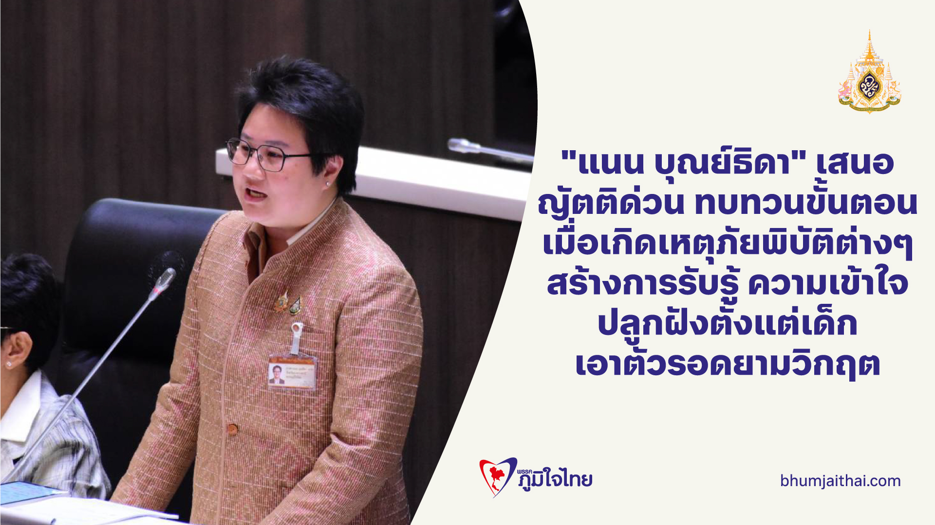 “แนน บุณย์ธิดา” เสนอญัตติด่วน ทบทวนขั้นตอนเมื่อประเทศเกิดเหตุภัยพิบัติต่างๆ แนะ ควรสร้างการรับรู้ ความเข้าใจ ปลูกฝังตั้งแต่เด็กในการเอาตัวรอดยามเกิดเหตุวิกฤต
