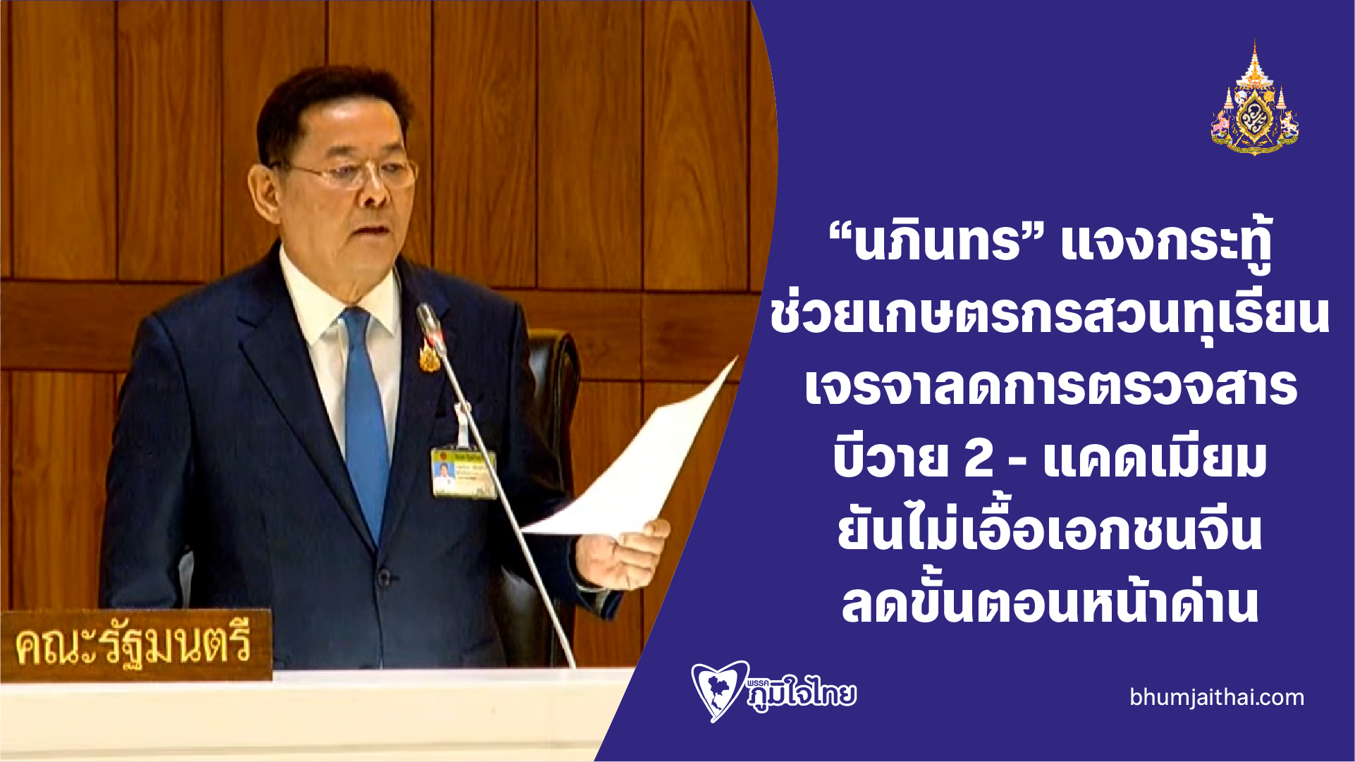 "นภินทร" แจงกระทู้ ช่วยเกษตรกรสวนทุเรียน เจรจาลดการตรวจสาร บีวาย 2 - แดดเมียม ยันไม่เอื้อเอกชนจีน ลดขั้นตอนหน้าด่าน