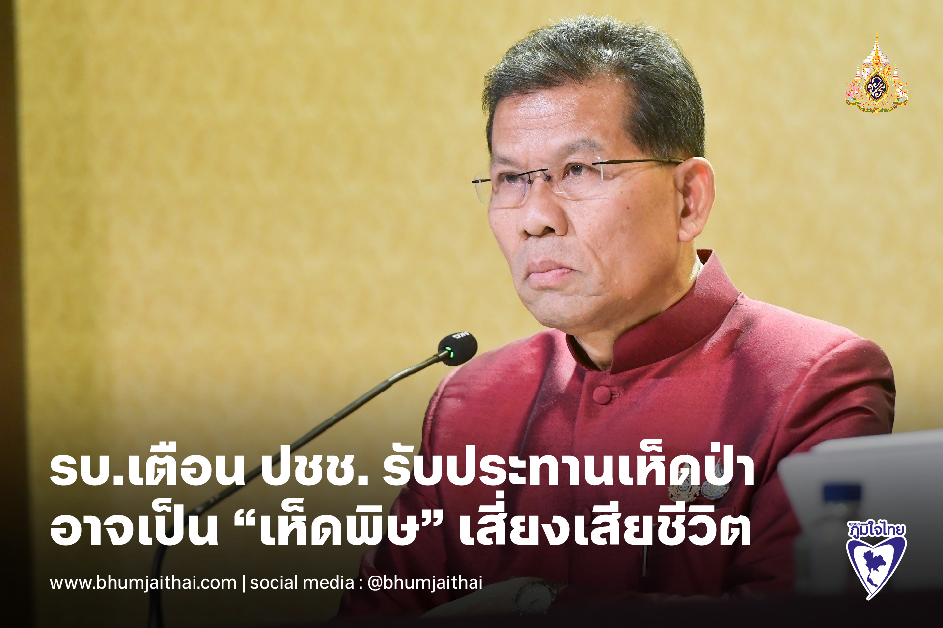 รัฐบาลเตือนประชาชน รับประทานเห็ดป่า เห็ดที่ขึ้นเองตามธรรมชาติ อาจเป็น “เห็ดพิษ” เสี่ยงเสียชีวิตได้ แนะยึดหลัก “เห็ด ไม่รู้จัก ไม่แน่ใจ ไม่เก็บ ไม่กิน” เพื่อความปลอดภัย