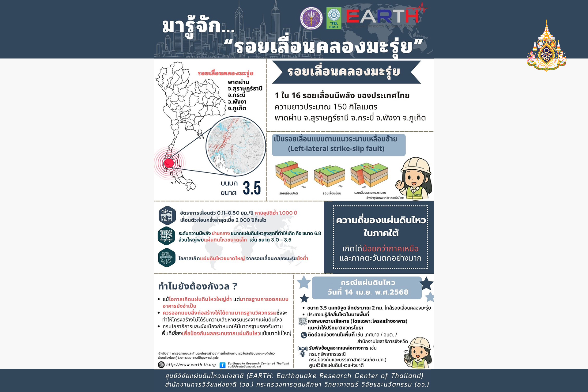 อว. สรุปเหตุการณ์แผ่นดินไหว จ.กระบี่ เมื่อวันที่ 14 เม.ย. 68 ขนาด 3.5 ใกล้รอยเลื่อนคลองมะรุ่ย