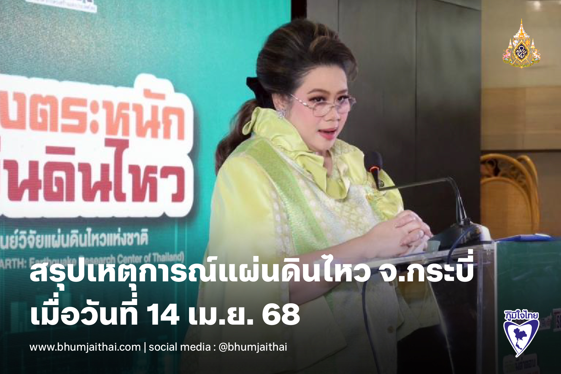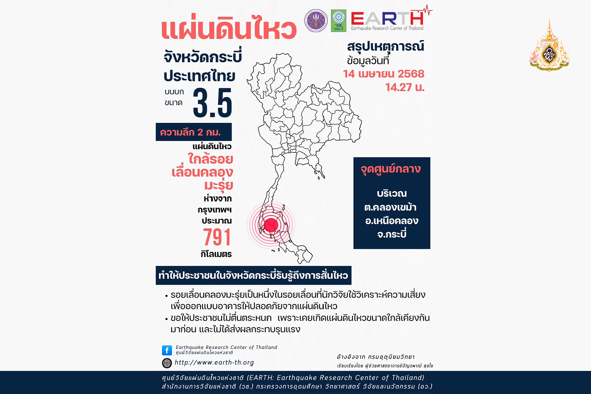 อว. สรุปเหตุการณ์แผ่นดินไหว จ.กระบี่ เมื่อวันที่ 14 เม.ย. 2568 ขนาด 3.5 ใกล้รอยเลื่อนคลองมะรุ่ย พร้อมเน้นย้ำความสำคัญของการเตรียมความพร้อมรับมือภัยพิบัติ