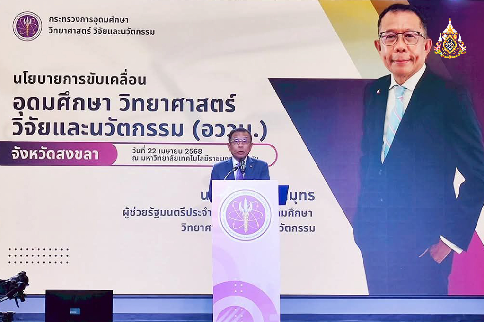 เมื่อวันที่ 22 เมษายน 2568 นายศุภชัย ใจสมุทร ผู้ช่วยรัฐมนตรีว่าการกระทรวงการอุดมศึกษา วิทยาศาสตร์ วิจัย และนวัตกรรม (อว.) พร้อมคณะ ลงพื้นที่ติดตามการดำเนินงานขับเคลื่อนงานด้าน อววน. ในพื้นที่จังหวัดสงขลา (เสริมทัพ/พัฒนาศักยภาพ ครูของกรมส่งเสริมการเรียนรู้ (ครู สกร.) ด้วย ววน. พื้นที่ภาคใต้) เยี่ยมชมผลงานนิทรรศการ และรับฟังการนำเสนอการใช้ประโยชน์นวัตกรรม ผลงานวิจัยจากผู้แทนชุมชน เยี่ยมชมนิทรรศการ และรับฟังการนำเสนอการใช้ประโยชน์นวัตกรรม ผลงานวิจัยจากผู้แทนชุมชน