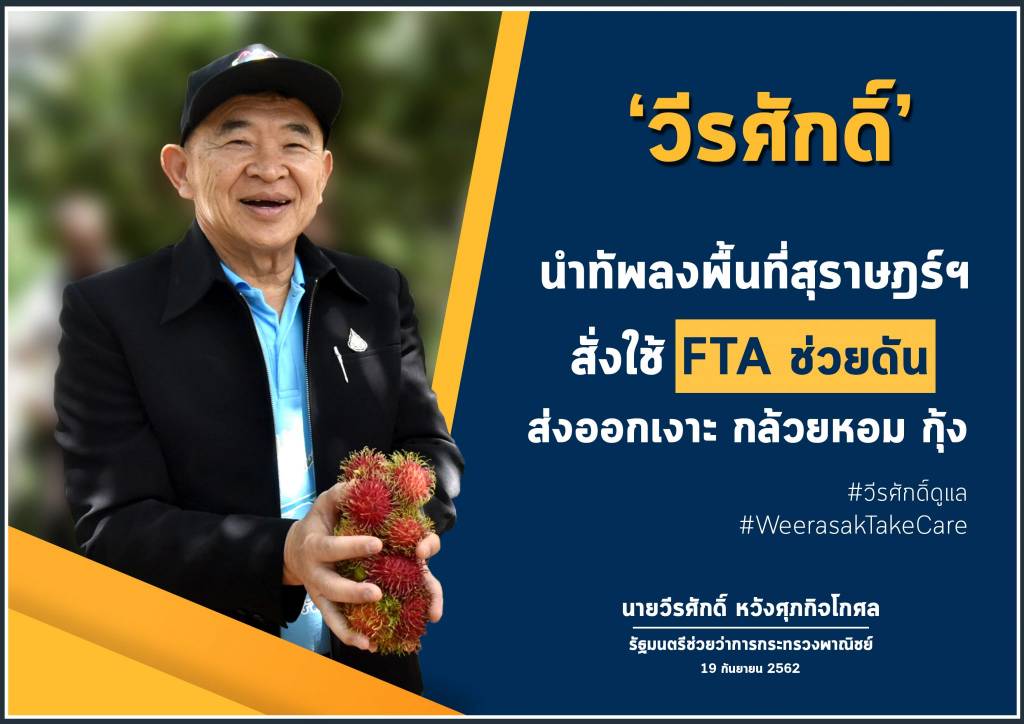 19 กันยายน 2562 เวลา 17:08“วีรศักดิ์” นำทัพ ลงพื้นที่ จ.สุราษฯ พบ เงาะ กล้วยหอม และกุ้ง มีศักยภาพส่งออก สั่งใช้ "เอฟทีเอ" ดันเต็มที่วันที่ 19 กันยายน 2562 นายวีรศักดิ์ หวังศุภกิจโกศล รัฐมนตรีช่วยว่าการกระทรวงพาณิชย์ เปิดเผยว่า การลงพื้นที่พบปะเกษตรกรและกลุ่มสหกรณ์ในจังหวัดสุราษฎร์ธานี ในวันนี้เพื่อต้องการทราบว่า สินค้าเกษตรท้องถิ่นที่มีศักยภาพในการส่งออกหรือที่มีการส่งออกอยู่แล้ว มีความต้องการให้กระทรวงพาณิชย์สนับสนุนให้สินค้าเหล่านั้นสามารถส่งออกไปยังต่างประเทศได้เพิ่มขึ้น ซึ่งพบว่าเงาะ กล้วยหอม และกุ้ง เป็นสินค้าที่มีศักยภาพ และมีการรวมกลุ่มตั้งเป็นสหกรณ์ที่มีการบริหารจัดการที่ดี และมีการส่งออกไปยังต่างประเทศบ้างแล้ว ซึ่งตนมองว่ายังมีช่องทางที่จะขยายการส่งออกได้เพิ่มขึ้นอีก โดยเฉพาะในประเทศที่เราทำความตกลงการค้าเสรีด้วย เช่น อาเซียน จีน และญี่ปุ่น ซึ่งไม่เก็บภาษีนำเข้าสินค้าส่วนใหญ่ที่ส่งออกจากไทย จึงอยากให้เกษตรกรใช้ประโยชน์จากความตกลงการค้าให้มากๆ และได้สั่งให้กรมเจรจาการค้าระหว่างประเทศช่วยเร่งให้ความรู้ความเข้าใจในเรื่องดังกล่าวอย่างเต็มที่ต่อไป และในวันที่ 20 กันยายน 2562 ตนจะเป็นประธานเปิดการสัมมนาเชิงปฏิบัติการ เรื่อง “ติดอาวุธสหกรณ์ไทยใช้ประโยชน์จากเอฟทีเอ” และ “ยกระดับการแข่งขันสหกรณ์ไทย ให้ก้าวไกลในโลกการค้าเสรี” ณ โรงแรมไดมอนด์ พลาซ่า จังหวัดสุราษฎร์ธานี ให้กับสมาชิกสหกรณ์ เกษตรกร ในจังหวัด สุราษฎร์ธานี นครศรีธรรมราช ชุมพร กระบี่ และพังงา เพื่อผลักดันนโยบายให้สหกรณ์และเกษตรกรใช้ประโยชน์จากความตกลงการค้าเสรี (เอฟทีเอ) นางอรมน ทรัพย์ทวีธรรม อธิบดีกรมเจรจาการค้าระหว่างประเทศ กล่าวเพิ่มเติมว่า กรมฯ ขานรับนโยบายของรัฐมนตรีช่วยว่าการกระทรวงพาณิชย์ โดยให้ความสำคัญกับการหาตลาดและกระจายสินค้าในภูมิภาคของไทยไปต่างประเทศ โดยใช้ประโยชน์จากเอฟทีเอ ช่วยสร้างรายได้ที่มั่นคงและยั่งยืนให้เกษตรกรและผู้ประกอบการไทย จึงร่วมมือกับกรมส่งเสริมสหกรณ์ดำเนินโครงการ “พัฒนาความพร้อมทางการค้าของสหกรณ์ไทยสู่การค้าเสรี” เพื่อขับเคลื่อนเศรษฐกิจภูมิภาคของไทยสู่สากล โดยในวันที่ 19 กันยายน 2562 รัฐมนตรีช่วยว่าการกระทรวงพาณิชย์นำคณะลงพื้นที่พบปะเกษตรกร และสหกรณ์การเกษตรบ้านนาสาร จำกัด จังหวัดสุราษฎร์ธานี ซึ่งเป็นศูนย์กลางในการรวบรวมผลไม้ของสมาชิกสหกรณ์ โดยเฉพาะเงาะนาสาร ที่ส่งออกไปจีน มาเลเซีย และสิงคโปร์ โดยปัจจุบันสหกรณ์รวบรวมเงาะได้วันละ 2.5 ตัน ส่งขายในราคากิโลกรัมละ 160 บ