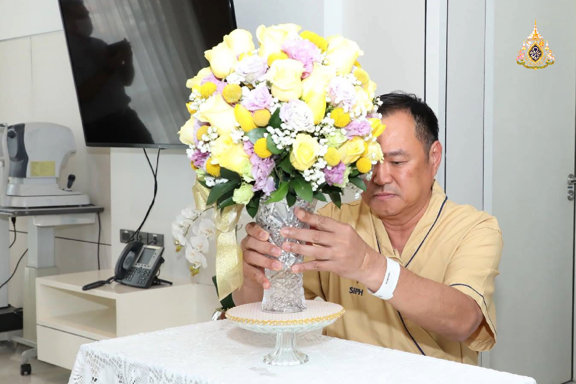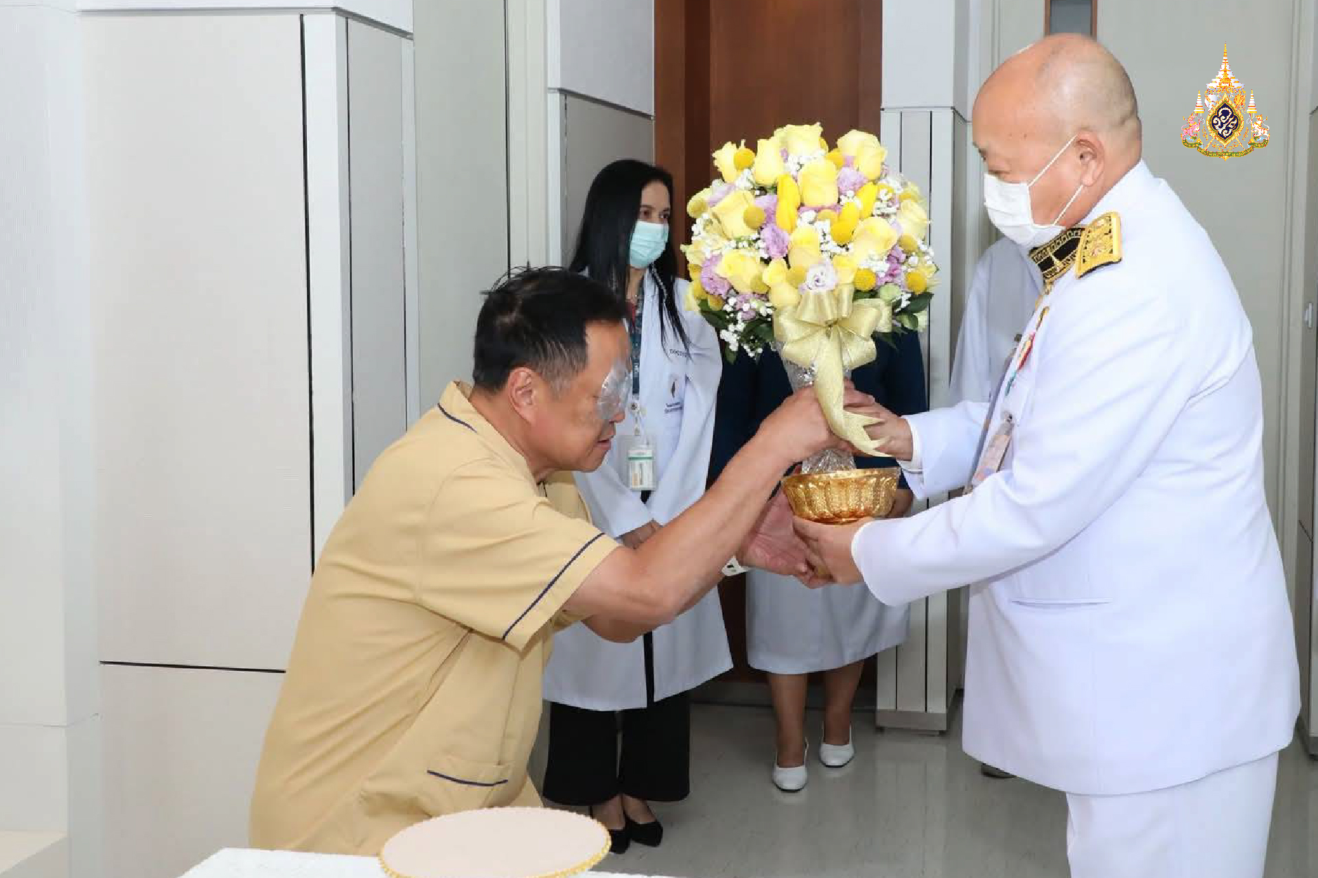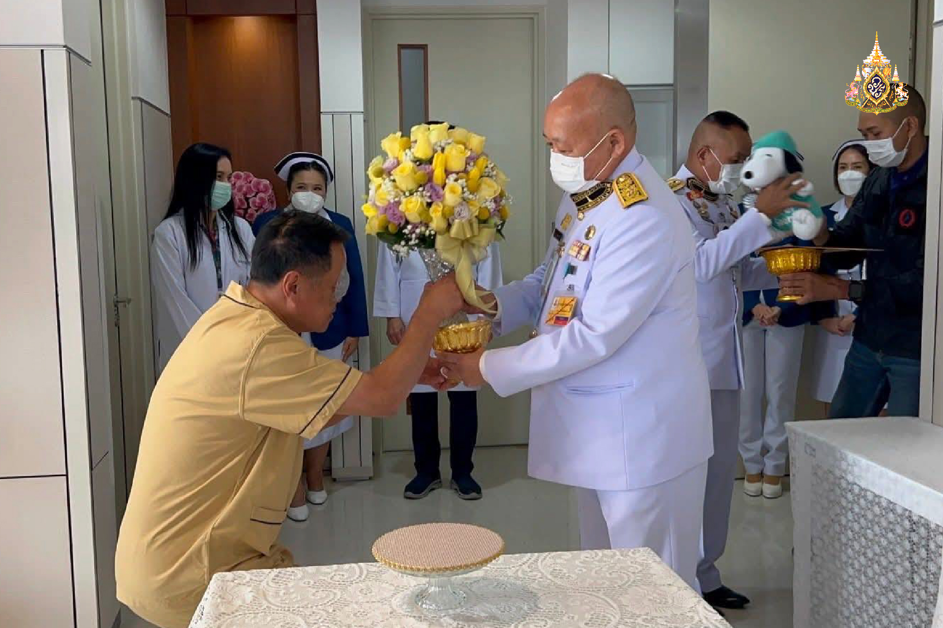 กรุณาโปรดเกล้าโปรดกระหม่อมให้ผู้แทนพระองค์อัญเชิญแจกันดอกไม้และของขวัญที่ล้นเกล้าฯ ทั้งสองพระองค์พระราชทานมาเยี่ยมไข้ที่โรงพยาบาลในวันนี้