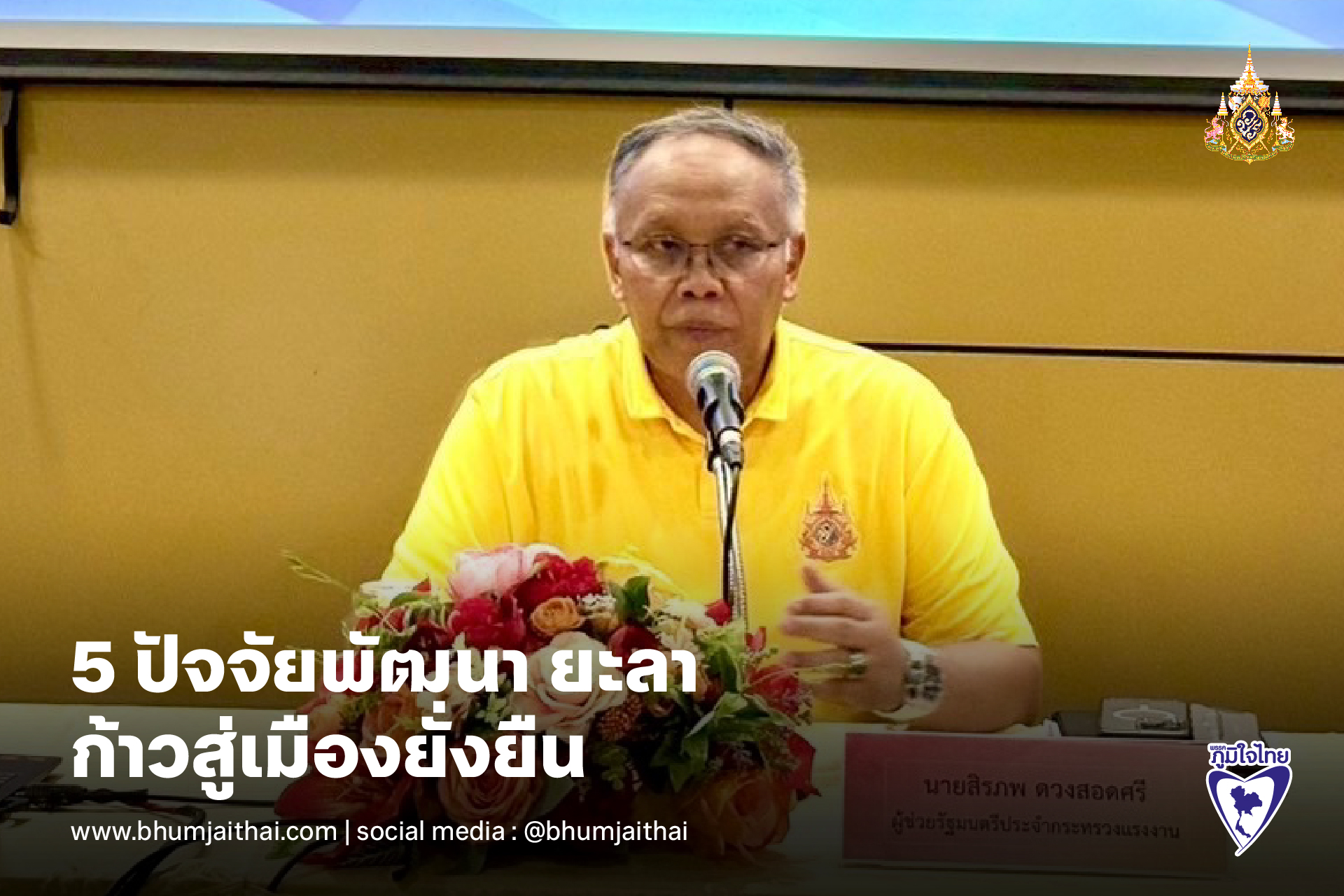 เมื่อวันที่ 14 พฤษภาคม 2568 นายสิรภพ ดวงสอดศรี ผู้ช่วยรัฐมนตรีประจำกระทรวงแรงงาน เป็นวิทยากรบรรยาย “ทิศทางการพัฒนาจังหวัดยะลา” ภายใต้โครงการประชุมเชิงปฏิบัติการทบทวนแผนพัฒนาจังหวัดยะลา พ.ศ.2566 – 2570 ฉบับทบทวน พ.ศ.2567 และแผนปฏิบัติราชการประจำปีของจังหวัดยะลา ประจำปีงบประมาณ พ.ศ.2570 ณ โรงแรม ศิวา รอยัล จังหวัดพัทลุง