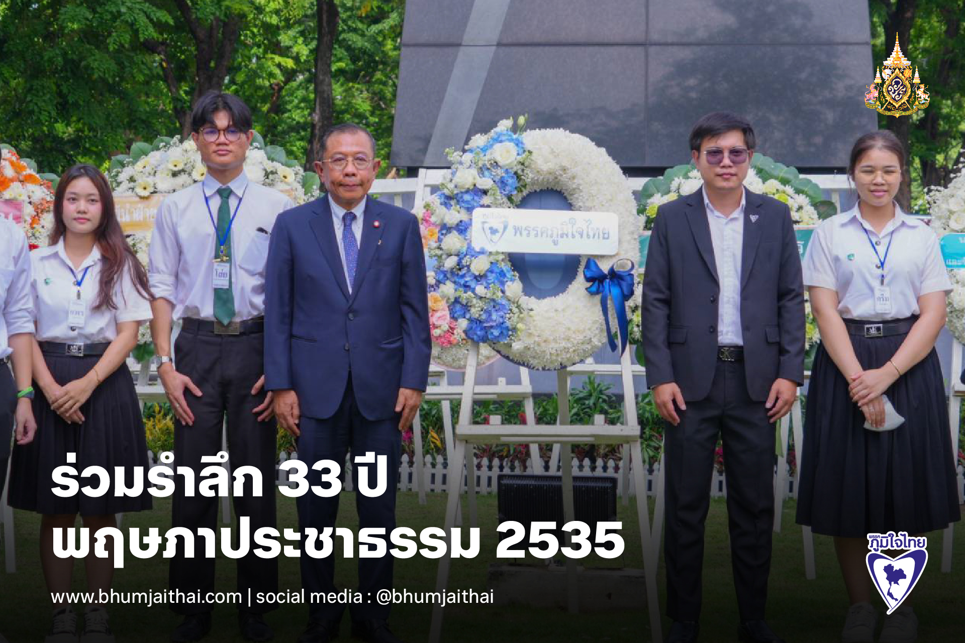 วันที่ 17 พฤษภาคม 2568 พรรคภูมิใจไทย ร่วมรำลึก 33 ปี พฤษภาประชาธรรม 2535 โดยมี นายศุภชัย ใจสมุทร ผู้ช่วยรัฐมนตรีประจํากระทรวงการอุดมศึกษา วิทยาศาสตร์ วิจัยและนวัตกรรม ในฐานะตัวแทนพรรคภูมิใจไทย ร่วมวางพวงมาลารำลึก 33 ปี พฤษภาประชาธรรม 2535 ณ อนุสรณ์สถาน พฤษภาประชาธรรม สวนสันติพร ถนนราชดำเนิน พร้อมกับหน่วยงานต่างๆ
