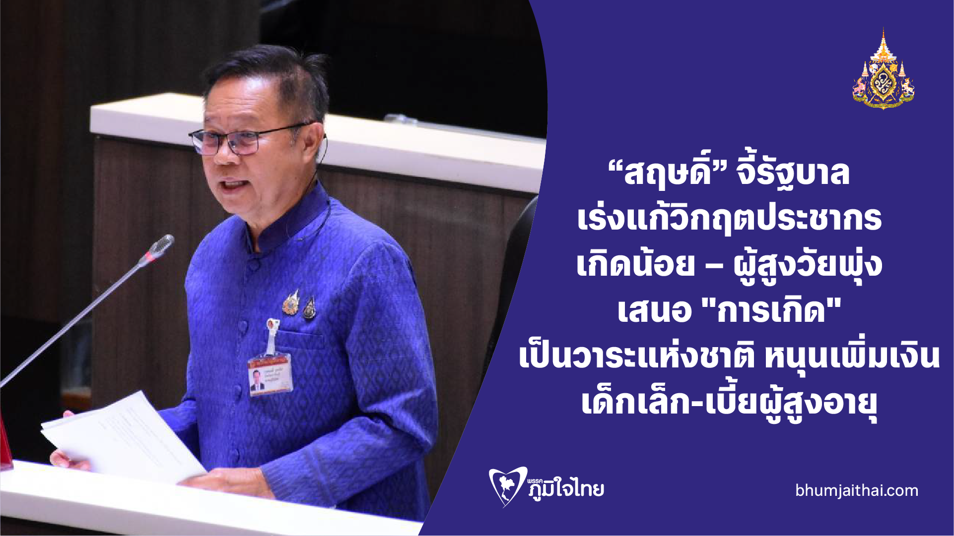 "สฤษดิ์" จี้รัฐบาล เร่งแก้วิกฤตประชากร เกิดน้อย - ผู้สูงวัยพุ่ง เสนอ "การเกิด" เป็นวาระแห่งชาติ หนุนเพิ่มเงิน เด็กเล็ก-เบี้ยผู้สูงอายุ