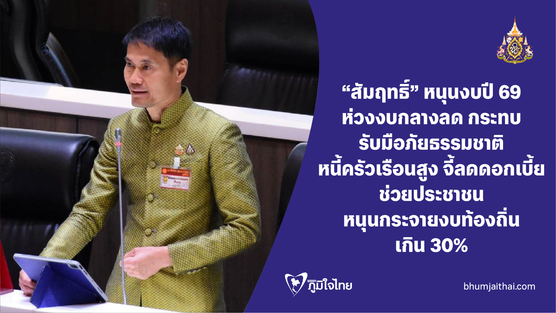 "สัมฤทธิ์" หนุนงบปี 69 ห่วงงบกลางลด กระทบรับมือภัยธรรมชาติ กังวลเกิดน้ำท่วมใหญ่-หนี้ครัวเรือนสูง จี้รัฐลดดอกเบี้ยช่วยประชาชน หนุนกระจายงบท้องถิ่นเกิน 30%