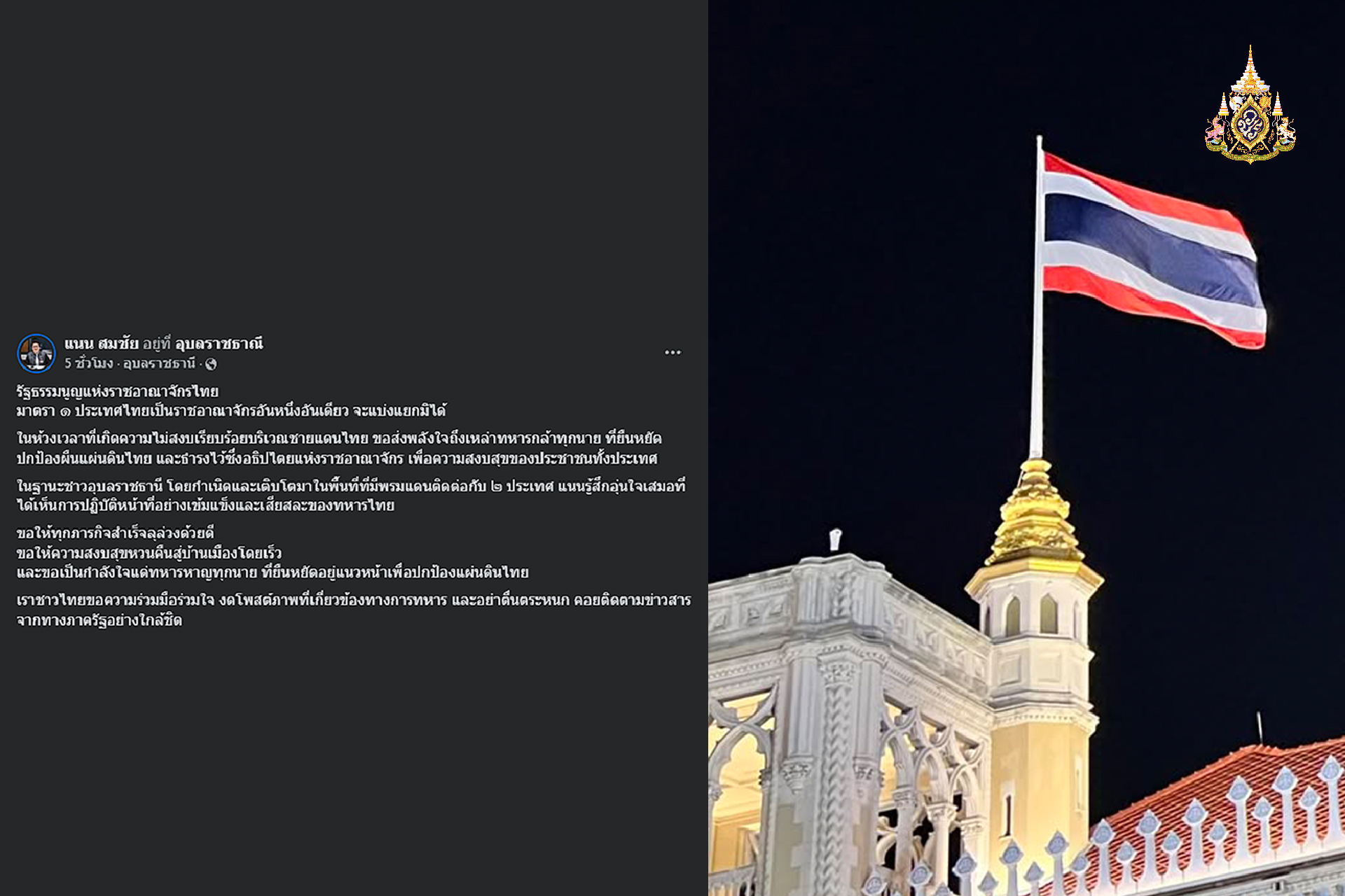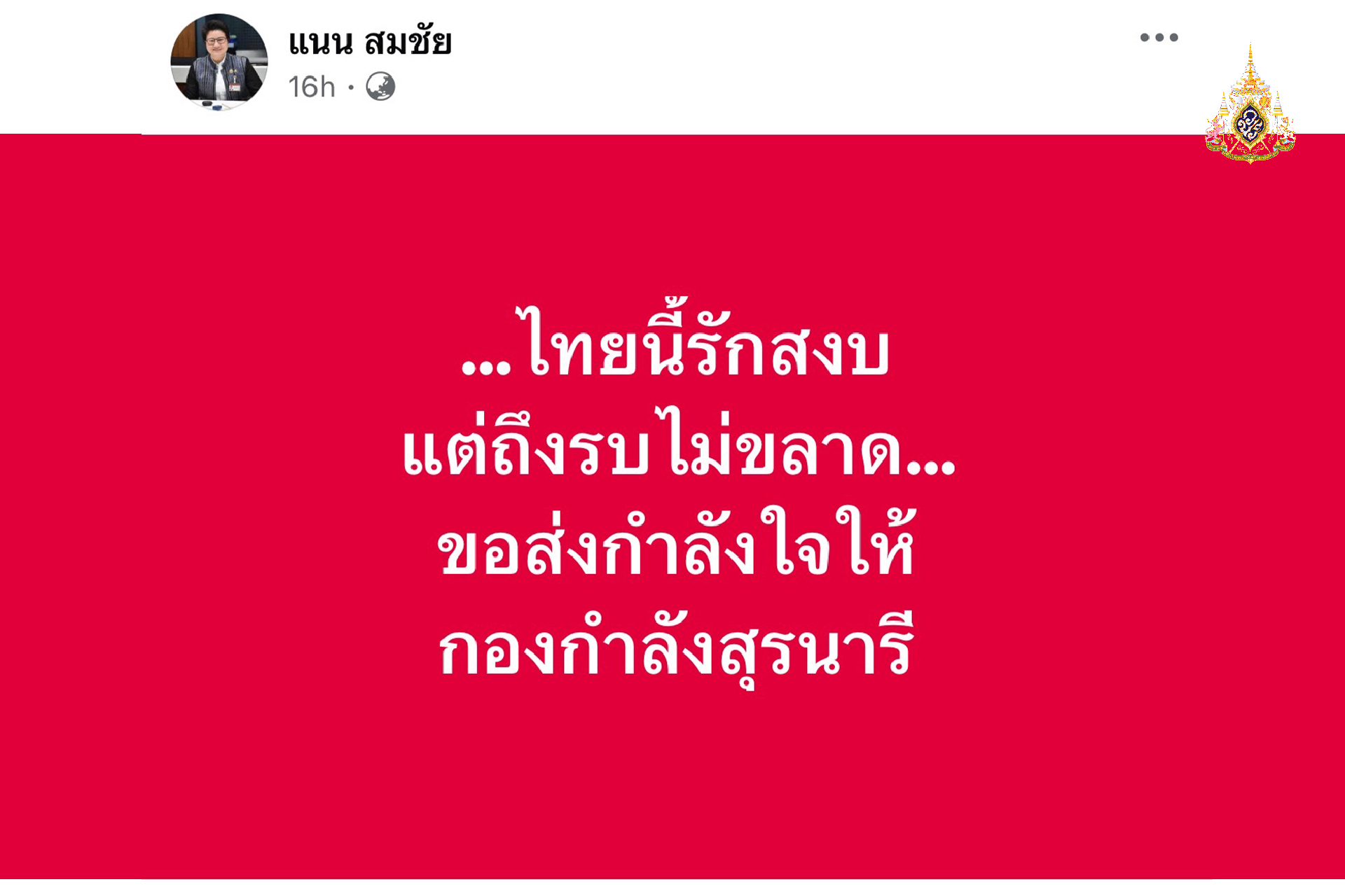 ”ขอให้ทุกภารกิจสำเร็จลุล่วงด้วยดี ขอให้ความสงบสุขหวนคืนสู่บ้านเมืองโดยเร็ว และขอเป็นกำลังใจแด่ทหารหาญทุกนาย ที่ยืนหยัดอยู่แนวหน้าเพื่อปกป้องแผ่นดินไทย“