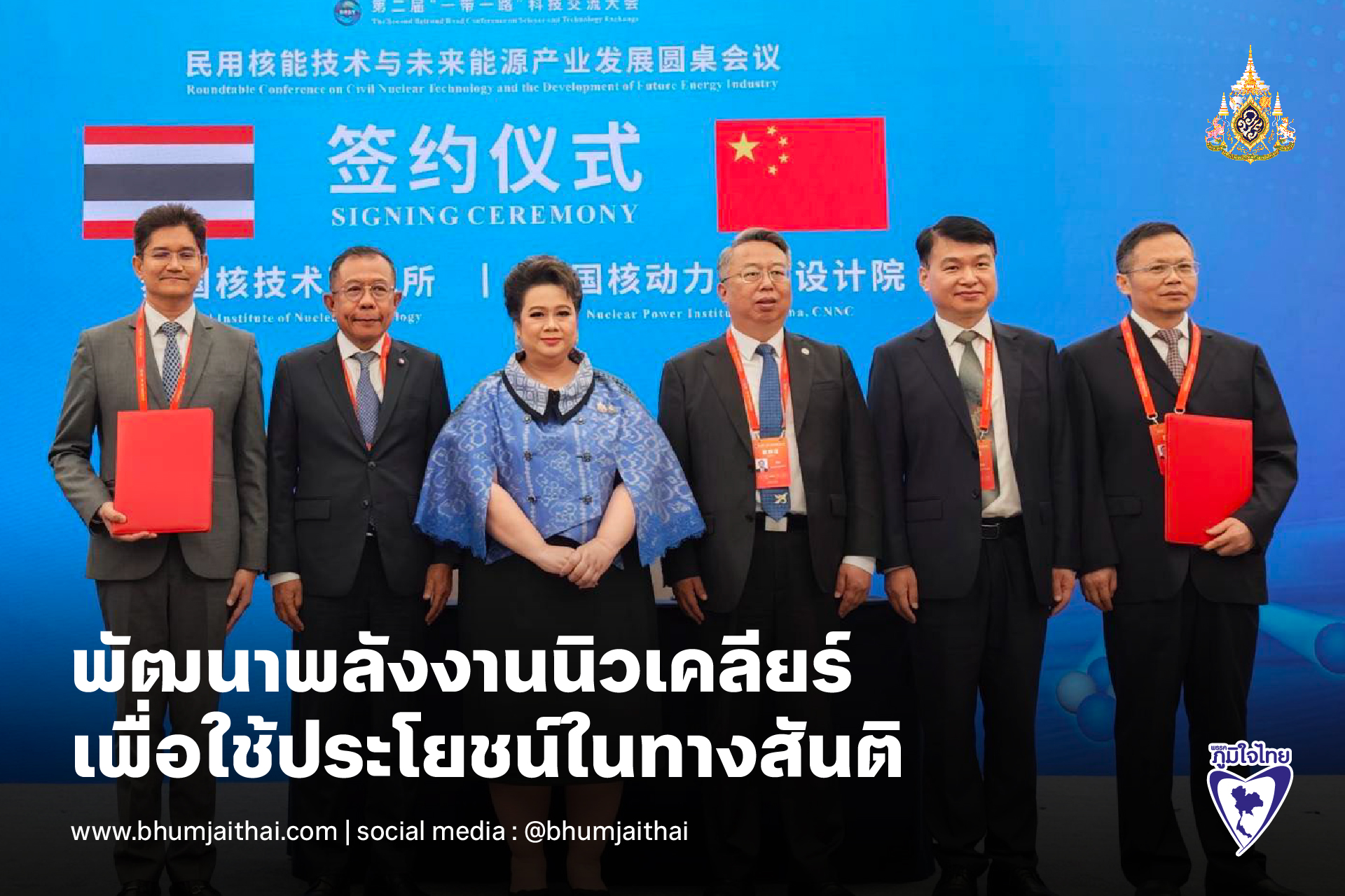 จากนั้น น.ส.ศุภมาส พร้อมด้วยนายศุภชัย ใจสมุทร ผู้ช่วย รมว.อว. ได้ร่วมเป็นสักขีพยานการลงนามบันทึกความเข้าใจ (MoU) ระหว่างสถาบันเทคโนโลยีนิวเคลียร์แห่งชาติ (องค์การมหาชน) หรือสทน.กับ Nuclear Power Institute of China (NPIC) เพื่อจัดตั้ง “ห้องปฏิบัติการร่วมด้านเครื่องปฏิกรณ์นิวเคลียร์ขนาดเล็ก (SMR Joint Laboratory)” โดยความร่วมมือครั้งนี้ถือเป็นก้าวสำคัญในการสร้างฐานความรู้ การวิจัยและนวัตกรรมด้านพลังงานนิวเคลียร์ของไทยพร้อมขยายความร่วมมือในอนาคตสู่สาขาอื่น ๆ ที่เกี่ยวข้อง ที่สำคัญการเดินหน้าร่วมมือระหว่างไทยและจีนในครั้งนี้ไม่เพียงช่วยเสริมความมั่นคงด้านพลังงาน แต่ยังตอกย้ำความเป็นพันธมิตรทางวิทยาศาสตร์และเทคโนโลยีในกรอบข้อริเริ่มสายแถบและเส้นทาง(Belt and Road Initiative - BRI) เพื่อก้าวสู่อนาคตที่ยั่งยืนร่วมกันด้วย