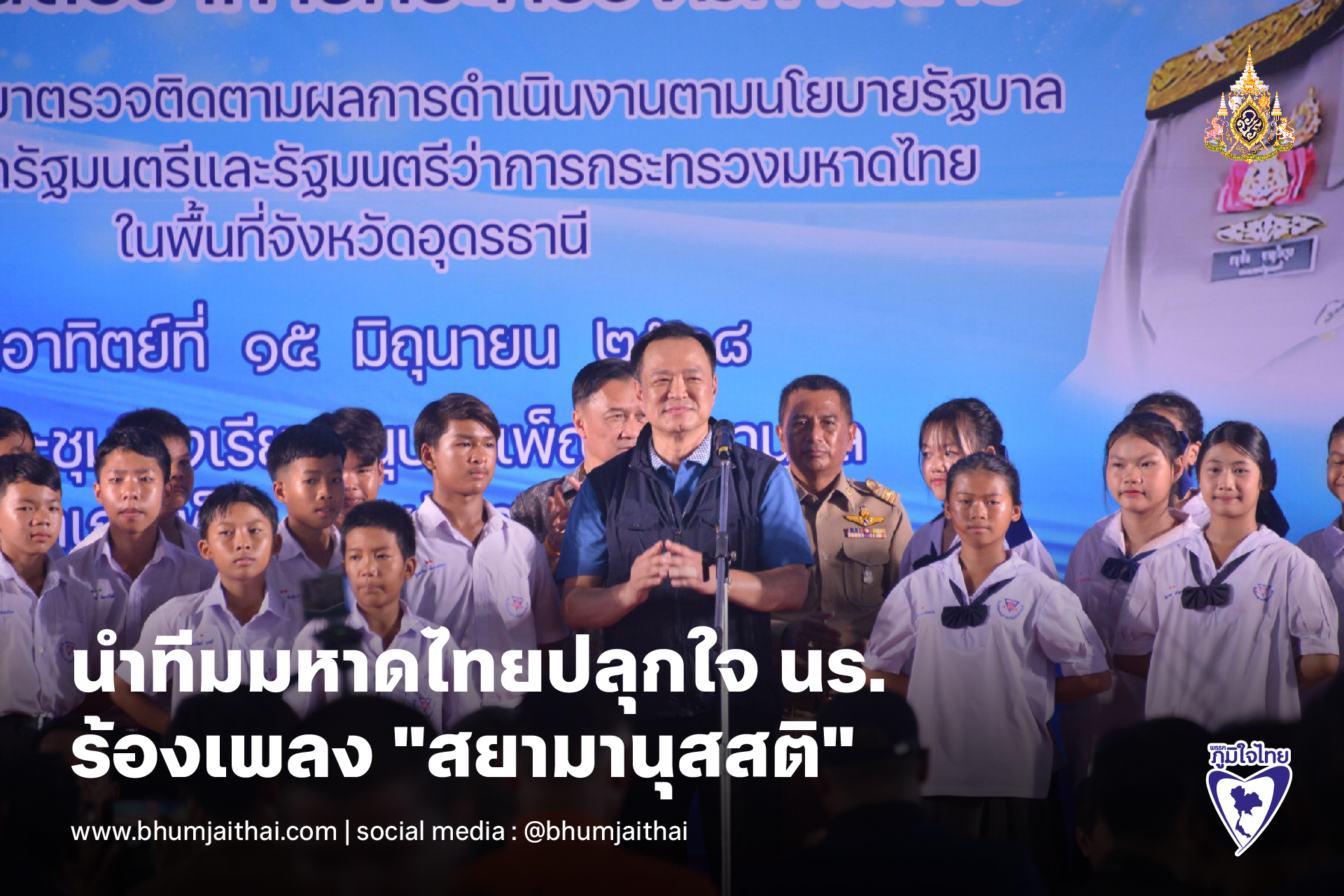 "อนุทิน" นำทีมมหาดไทย ปลุกใจนักเรียน ร่วมร้องบทเพลง "สยามานุสสติ" ในการตรวจราชการพื้นที่อำเภอเพ็ญ จังหวัดอุดรธานี ด้วยความฮึกเหิม