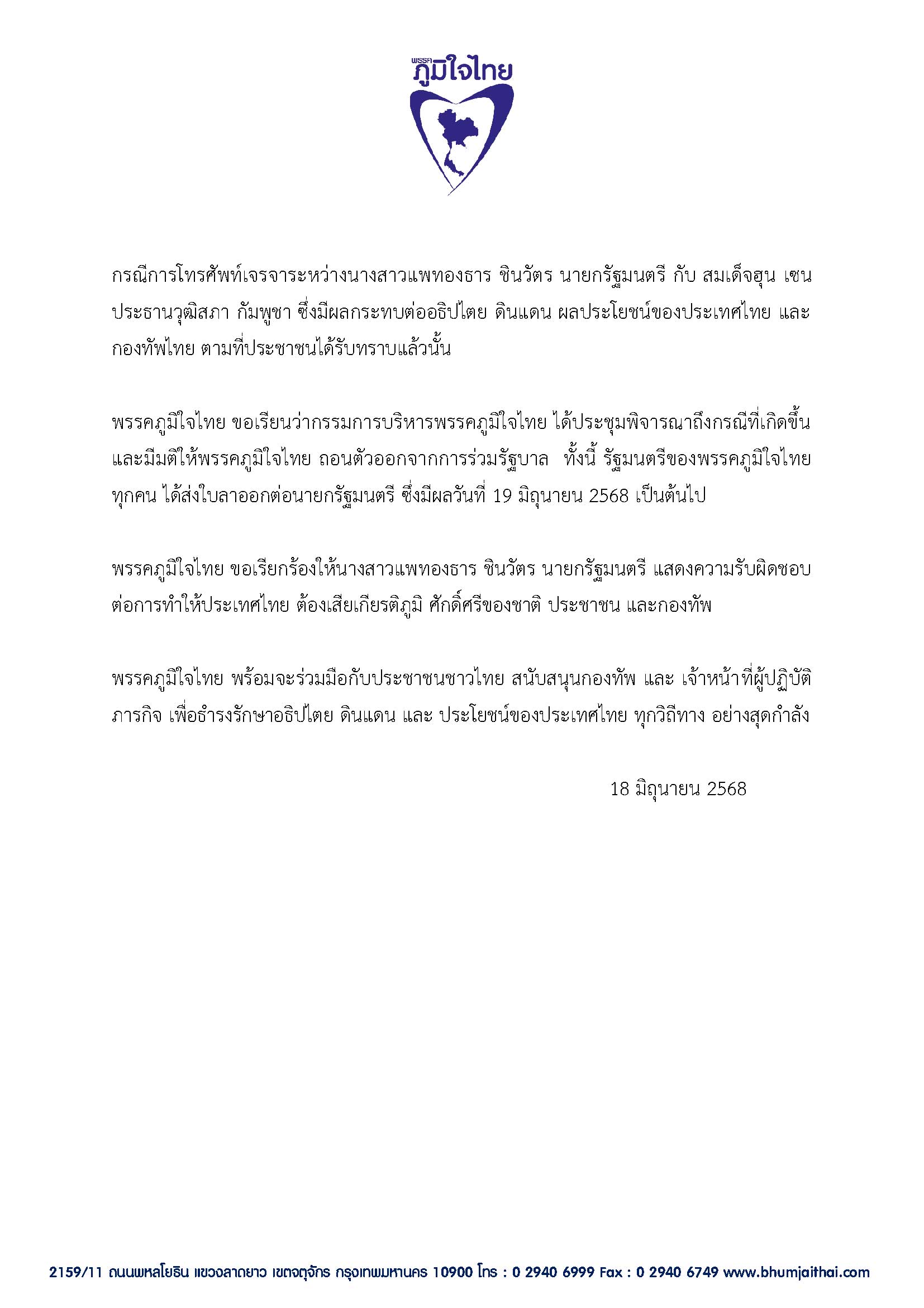 แถลงการณ์พรรคภูมิใจไทย