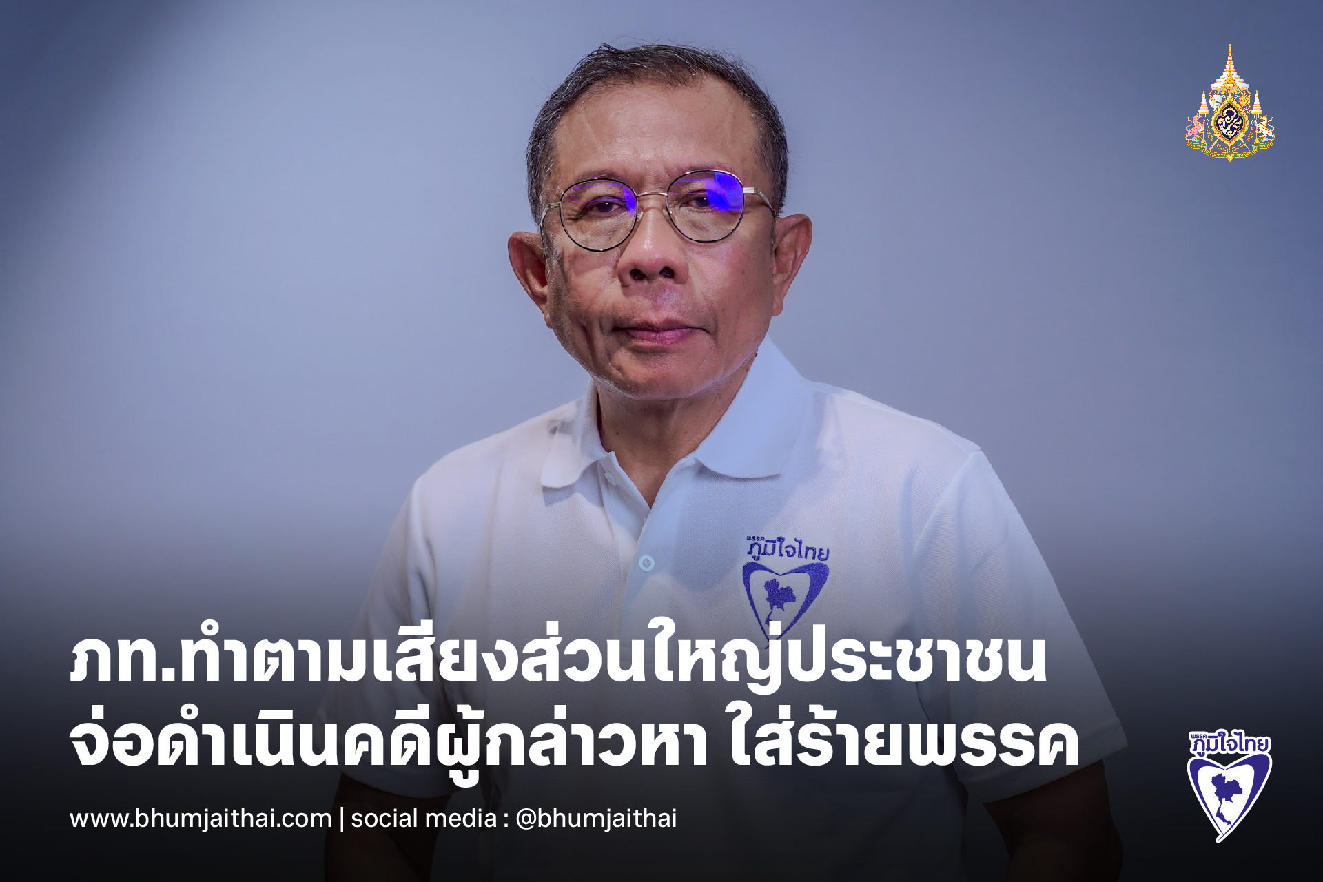 พรรคภูมิใจไทยจะใช้สิทธิตามกฎหมายในการดำเนินคดีกับผู้ที่กล่าวเท็จใส่ร้ายป้ายสี พาดพิงต่อพรรค โพสต์ข้อความหรือเผยแพร่ข้อความลักษณะดังกล่าวนั้น