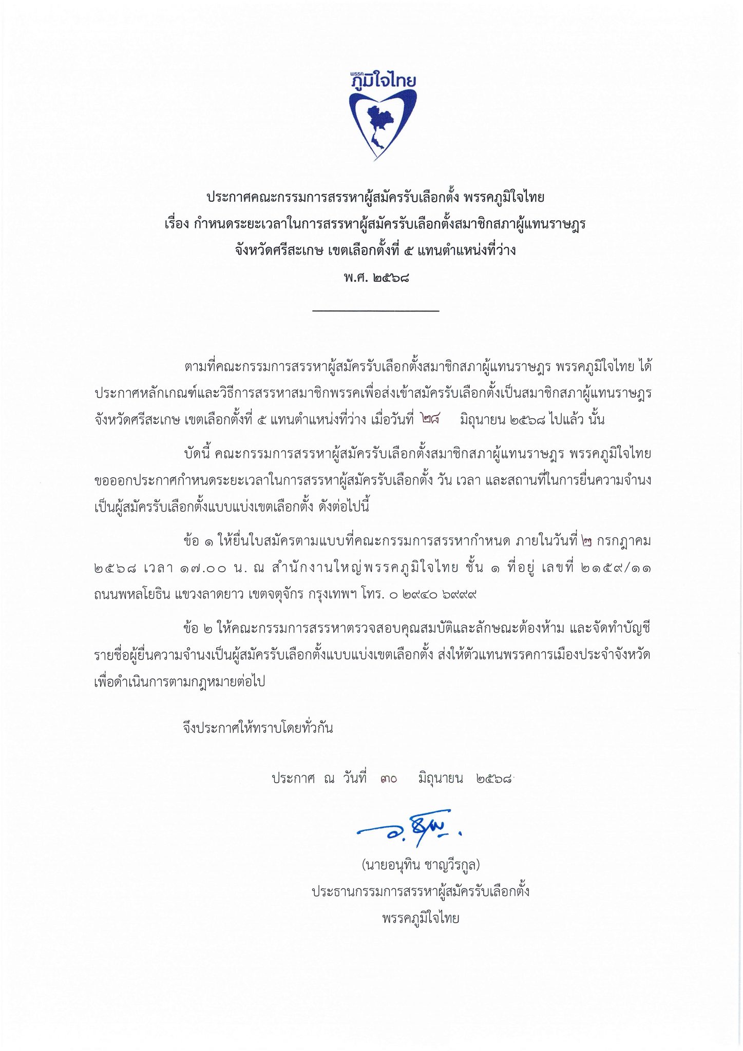 30 มิถุนายน 2568 เวลา 11:30ประกาศคณะกรรมการสรรหาผู้สมัครรับเลือกตั้ง พรรคภูมิใจไทย เรื่อง กำหนดระยะเวลาในการสรรหาผู้สมัครรับเลือกตั้งสมาชิกสภาผู้แทนราษฎร จังหวัดศรีสะเกษ เขตเลือกตั้งที่ ๕ แทนตำแหน่งที่ว่าง พ.ศ. ๒๕๖๘แชร์บทความนี้: