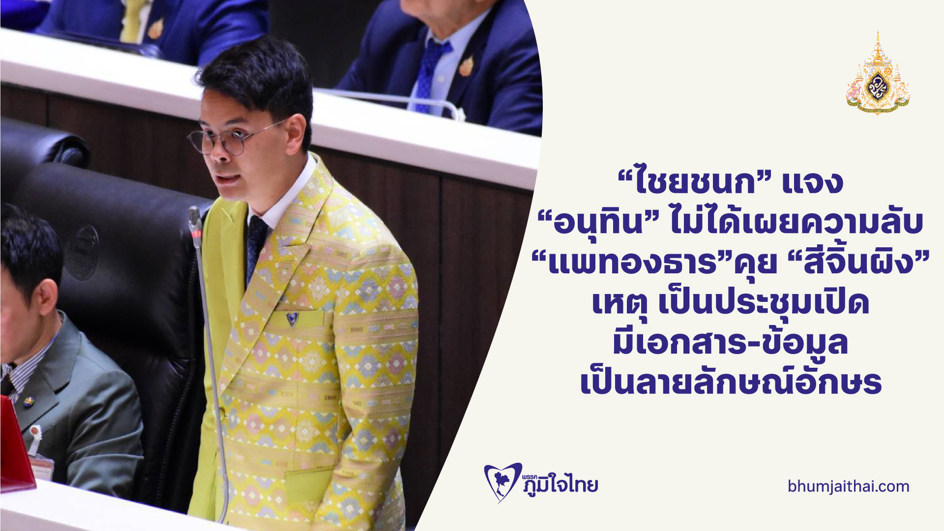 9 กรกฎาคม 2568 นายไชยชนก ชิดชอบ สมาชิกสภาผู้แทนราษฎร (สส.) จังหวัดบุรีรัมย์ ในฐานะเลขาธิการพรรคภูมิใจไทย กล่าวอภิปรายว่า ตนเองขอใช้เวลาในการอธิบายถึงประชาชนในประเด็นแรกที่กล่าวหาว่านายอนุทิน ชาญวีรกูล หัวหน้าพรรคภูมิใจไทย นำข้อมูลในที่ประชุมลับออกมานั้น ขอชี้แจงว่า ไม่ใช่การประชุมลับ เป็นการประชุมเปิด มีเอกสาร และมีข้อมูลออกมาเป็นลายลักษณ์อักษรด้วย ซึ่งเป็นความคิดเห็นของผู้นำประเทศจีน