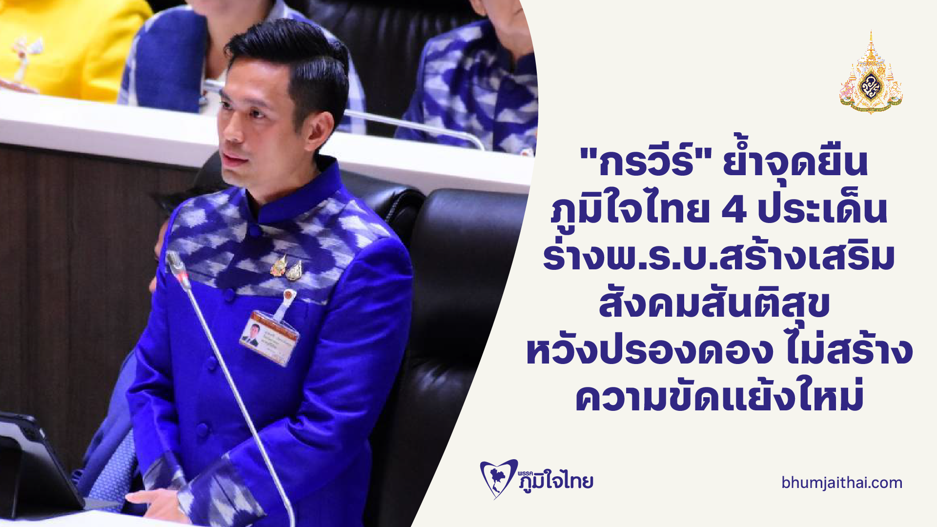 "กรวีร์" ย้ำ จุดยืนภูมิใจไทย 4 ประเด็นหลัก ร่างพ.ร.บ.สร้างเสริมสังคมสันติสุข ถอดบทเรียนปี 56 หวังปรองดอง ไม่สร้างความขัดแย้งใหม่