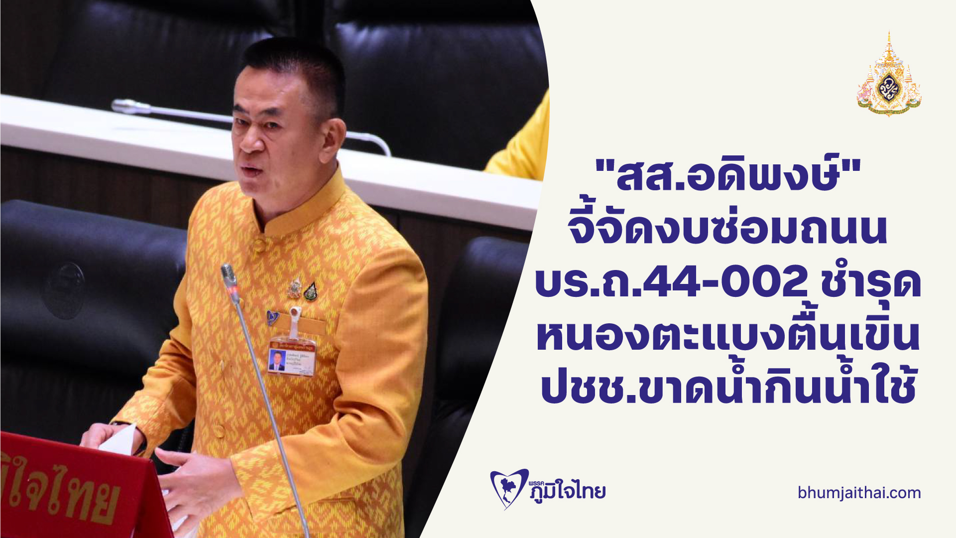 จัดงบด่วน! "สส.อดิพงษ์" จี้เร่งซ่อมถนนบร.ถ.44-002 ชำรุด เกิดอุบัติเหตุบ่อยครั้ง - หนองตะแบง ตื้นเขิน ประชาชนขาดน้ำอุปโภคบริโภค