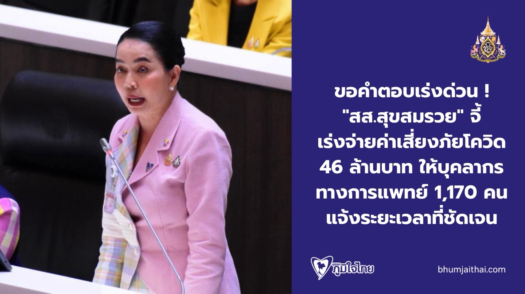 ขอคําตอบเร่งด่วน! "สส.สุขสมรวย" จี้ เร่งจ่ายค่าเสี่ยงภัยโควิด 46 ล้านบาท ให้บุคลากรทางการแพทย์ 1,170 คน พร้อมแจ้งระยะเวลาที่ชัดเจน
