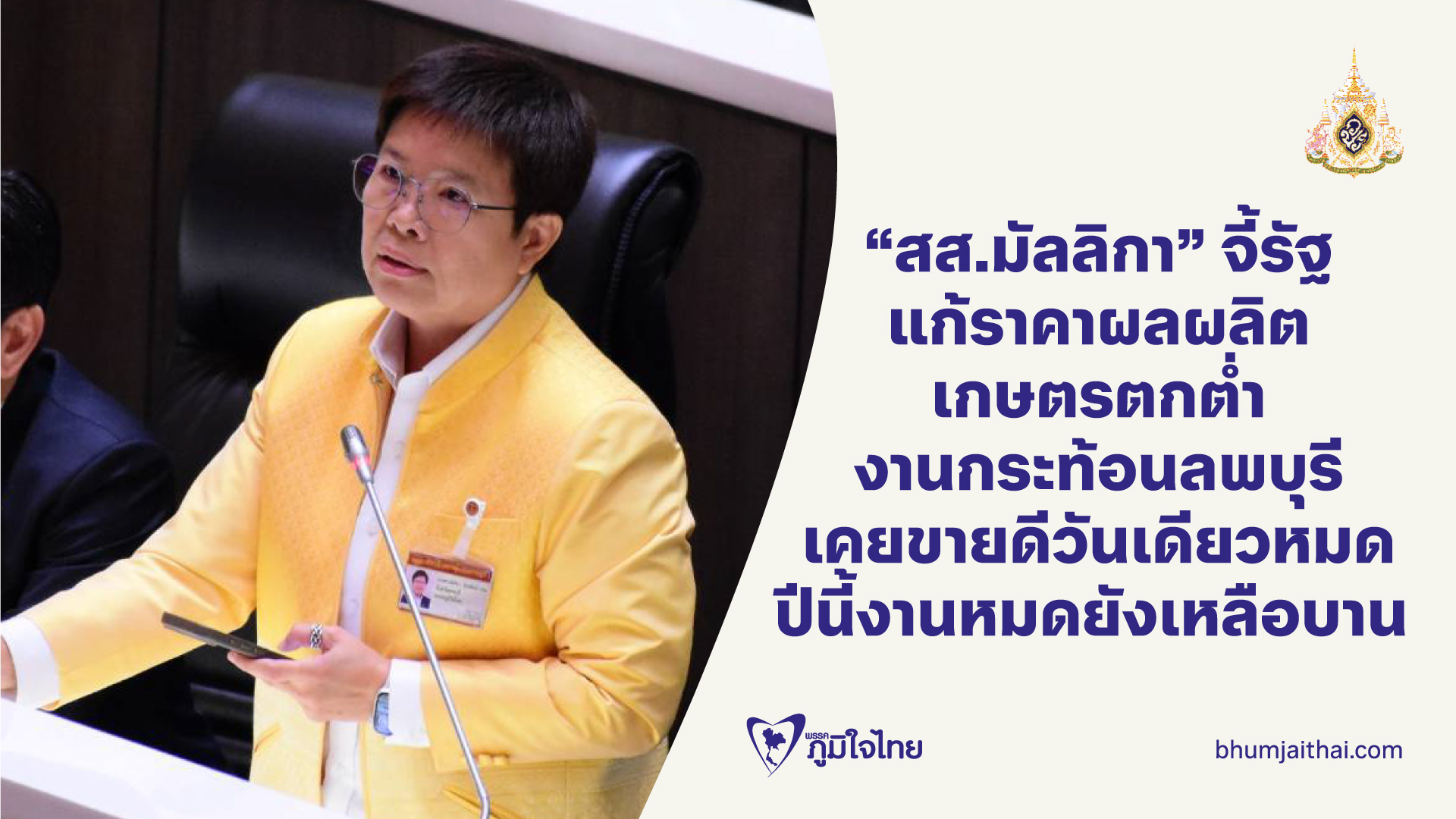 ผลผลิตตกต่ำ! สส.มัลลิกา จี้รัฐบาลแก้ราคาผลผลิตเกษตรตกต่ำ ข้าวหอมปทุมจาก 1 หมื่น ตอนนี้เหลือ 7,000 กว่าบาท งานกระท้อนลพบุรี เคยขายดีวันเดียวหมด ปีนี้งานหมดยังเหลือบาน พร้อมขอขยายถนน แก้ปัญหาน้ำขาดแคลน และติดตั้งเครื่องกรองน้ำสำหรับดื่ม