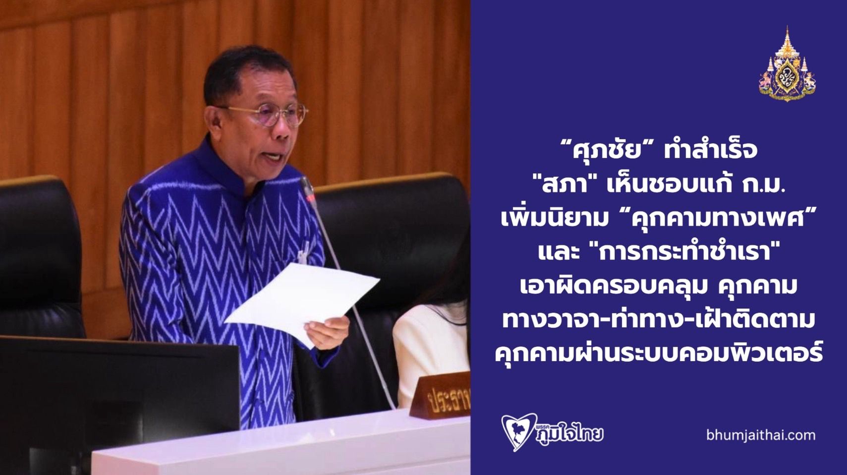 ผ่านฉลุย! “ศุภชัย” ปลื้ม ทำสำเร็จ "สภา" เห็นชอบแก้ ก.ม. เพิ่มนิยาม “คุกคามทางเพศ” และ "การกระทำชำเรา" เอาผิดครอบคลุมทั้งการคุกคามทางวาจา-ท่าทาง-เฝ้าติดตาม- คุกคามผ่านระบบคอมพิวเตอร์ คุก 1-5ปี
