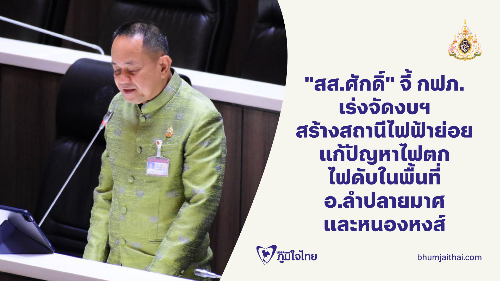 "สส.ศักดิ์" จี้ กฟภ. เร่งจัดงบฯ สร้างสถานีไฟฟ้าย่อย แก้ปัญหาไฟตก ไฟดับในพื้นที่ อ.ลำปลายมาศ และหนองหงส์
