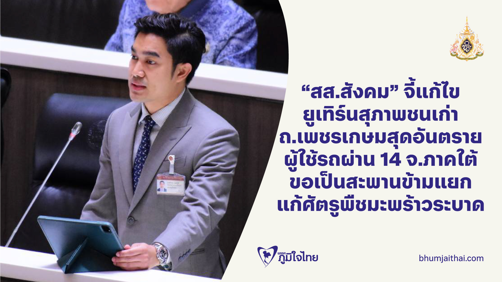 แก้ด่วน ยูเทิร์นอันตราย ! สส.สังคม ขอคมนาคมแก้ไขยูเทิร์นสุภาพชนเก่า ถนนเพชรเกษมสุดอันตราย ผู้ใช้รถผ่าน 14 จังหวัดภาคใต้ ขอเป็นสะพานข้ามแยก หรือเป็นสะพานเบี่ยงกลับรถ พร้อมให้ ก.เกษตร รีบแก้ปัญหาศัตรูพืชมะพร้าว ระบาดหนัก